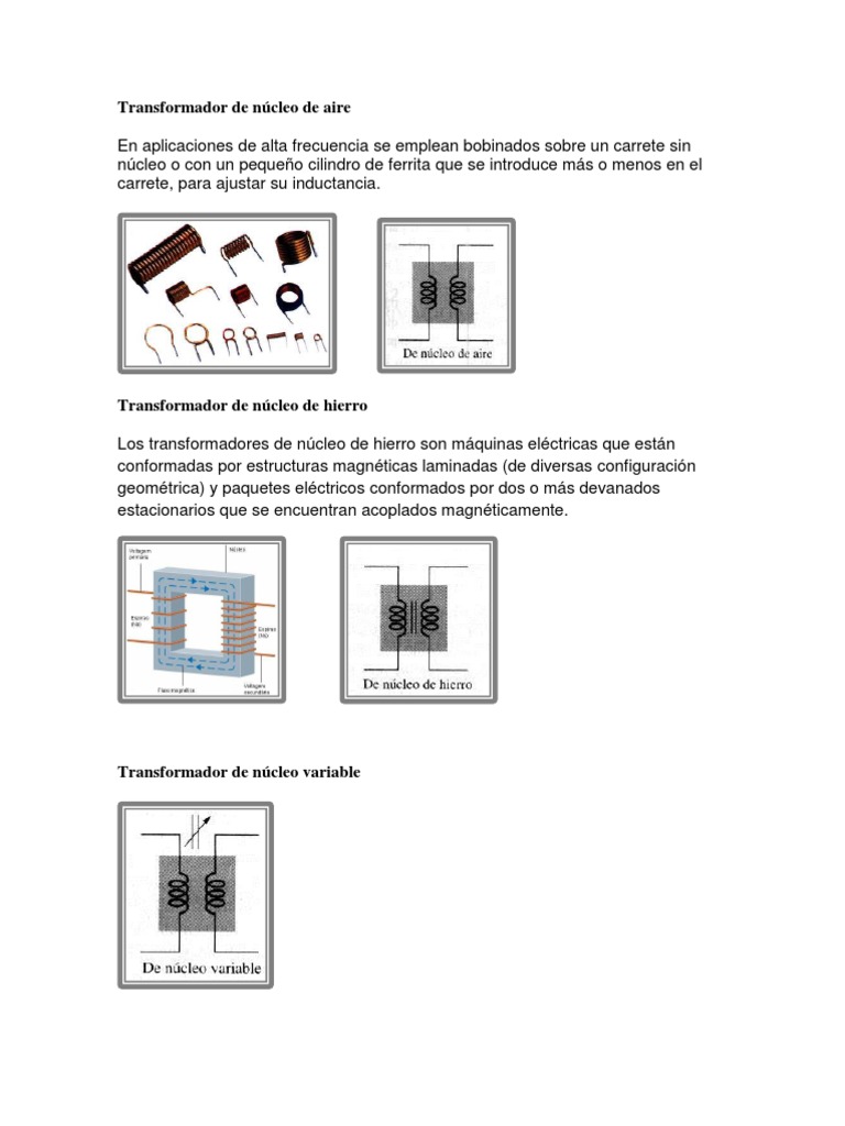 Transformador de pulsos: Est destinado a funcionar en rgimen de pulsos debido a su rpida respuesta. Transformador de lnea o flyback: Estos son transformadores de pulsos. Con aplicaciones especiales como televisores con TRC (CRT) para generar la alta tensin y la corriente para las bobinas de deflexin horizontal. Entre otras propiedades, frecuentemente proporciona otras tensiones para el tubo. Transformador con diodo dividido: Su nombre se debe a que est constituido por varios diodos menores en tamao, repartidos por el bobinado y conectados en serie, de modo que cada diodo slo tiene que soportar una tensin inversa relativamente baja. La salida del transformador va directamente al nodo del tubo, sin diodo ni triplicador. Transformador de impedancia: Usado como adaptador de antenas y lneas de transmisin, era imprescindible en los amplificadores de vlvulas para adaptar la alta impedancia de los tubos a la baja de los altavoces. Transformador Electrnico: Se caracteriza por ser muy utilizados en la actualidad en aplicaciones como cargadores para celulares. Utiliza un Corrector de factor de potencia de utilizacin imprescindible en los circuitos de fuente de alimentaciones conmutadas en lugar de circuitos. Transformador de grano orientado, Auto transformador. El primario y el secundario constituyen un bobinado nico. Pesa menos y es ms barato que un transformador y por ello se emplea habitualmente para convertir 220V a 125V y viceversa y en otras aplicaciones equivalentes. Transformador toroidal. Son ms voluminosos, pero el flujo magntico se confina en el ncleo, teniendo flujos de dispersin muy reducidos y bajas prdidas por corrientes de Foucault. Transformador de grano orientado. El ncleo se conforma por una placa de hierro de grano orientado, que se envuelve en s misma, siempre con la misma direccin, en lugar de las lminas de hierro dulce separadas habituales. Las prdidas son escasas pero es de alto costo. Estos tipos son los ms utilizados, pero existen otros diversos modelos segn el tipo de aplicacin a la cual son destinados.