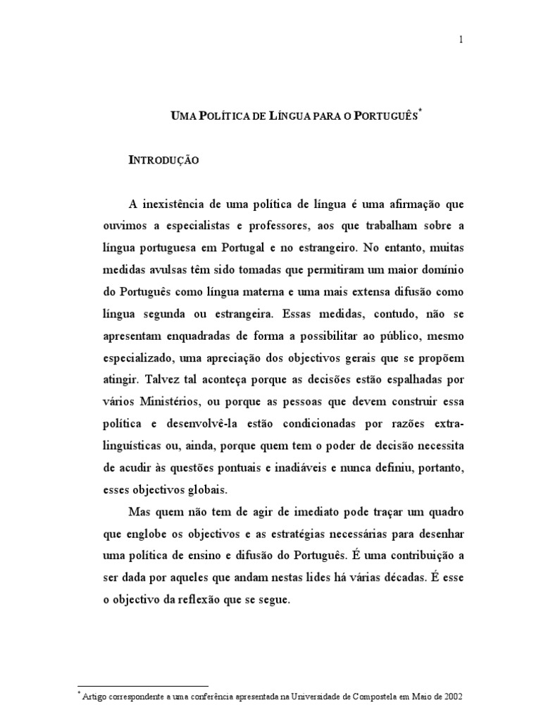A inexistência de uma política de língua é uma afirmação que ouvimos a especialistas e professores, aos que trabalham sobre a língua portuguesa em Portugal e no estrangeiro. No entanto, muitas medidas avulsas têm sido tomadas que permitiram um maior domínio do Português como língua materna e uma mais extensa difusão como língua segunda ou estrangeira. Essas medidas, contudo, não se apresentam enquadradas de forma a possibilitar ao público, mesmo especializado, uma apreciação dos objectivos gerais que se propõem atingir. Talvez tal aconteça porque as decisões estão espalhadas por vários Ministérios, ou porque as pessoas que devem construir essa política e desenvolvê-la estão condicionadas por razões extra- linguísticas ou, ainda, porque quem tem o poder de decisão necessita de acudir às questões pontuais e inadiáveis e nunca definiu, portanto, esses objectivos globais. Mas quem não tem de agir de imediato pode traçar um quadro que englobe os objectivos e as estratégias necessárias para desenhar uma política de ensino e difusão do Português. É uma contribuição a ser dada por aqueles que andam nestas lides há várias décadas. É esse o objectivo da reflexão que se segue.
