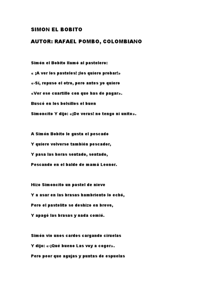 Simn el Bobito llam al pastelero: A ver los pasteles! los quiero probar! -S, repuso el otro, pero antes yo quiero Ver ese cuartillo con que has de pagar. Busc en los bolsillos el buen Simoncito Y dijo: De veras! no tengo ni unito.