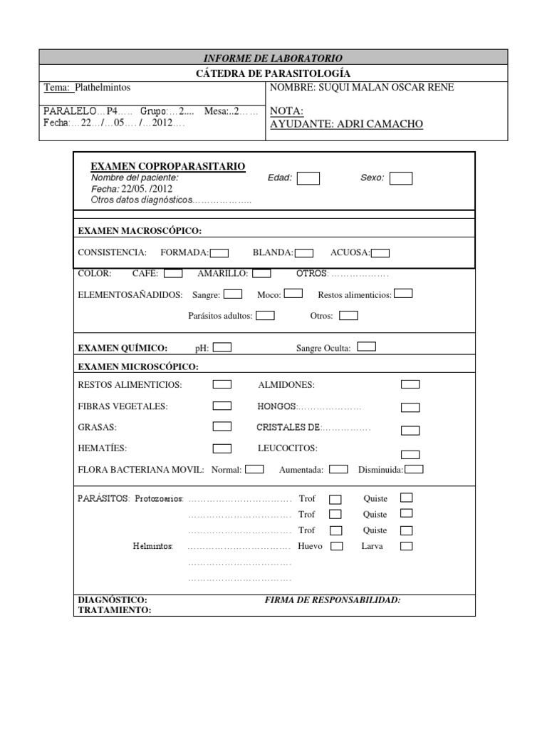 INFORME DE LABORATORIO Tema: Plathelmintos CTEDRA DE PARASITOLOGA NOMBRE: SUQUI MALAN OSCAR RENE