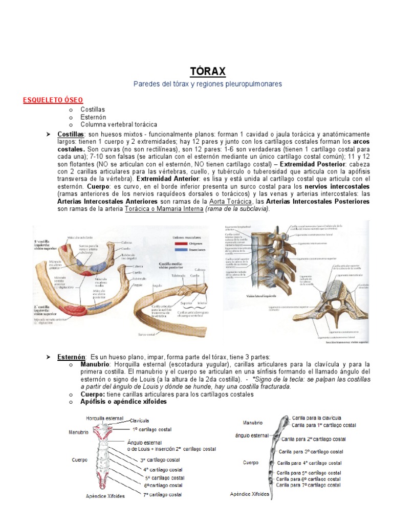 Esternn: Es un hueso plano, impar, forma parte del trax, tiene 3 partes: o Manubrio: Horquilla esternal (escotadura yugular), carillas articulares para la clavcula y para la primera costilla. El manubrio y el cuerpo se articulan en una snfisis formando el llamado ngulo del esternn o signo de Louis (a la altura de la 2da costilla). - *Signo de la tecla: se palpan las costillas a partir del ngulo de Louis y dnde se hunde, hay una costilla fracturada. o Cuerpo: tiene carillas articulares para los cartlagos costales o Apfisis o apndice xifoides