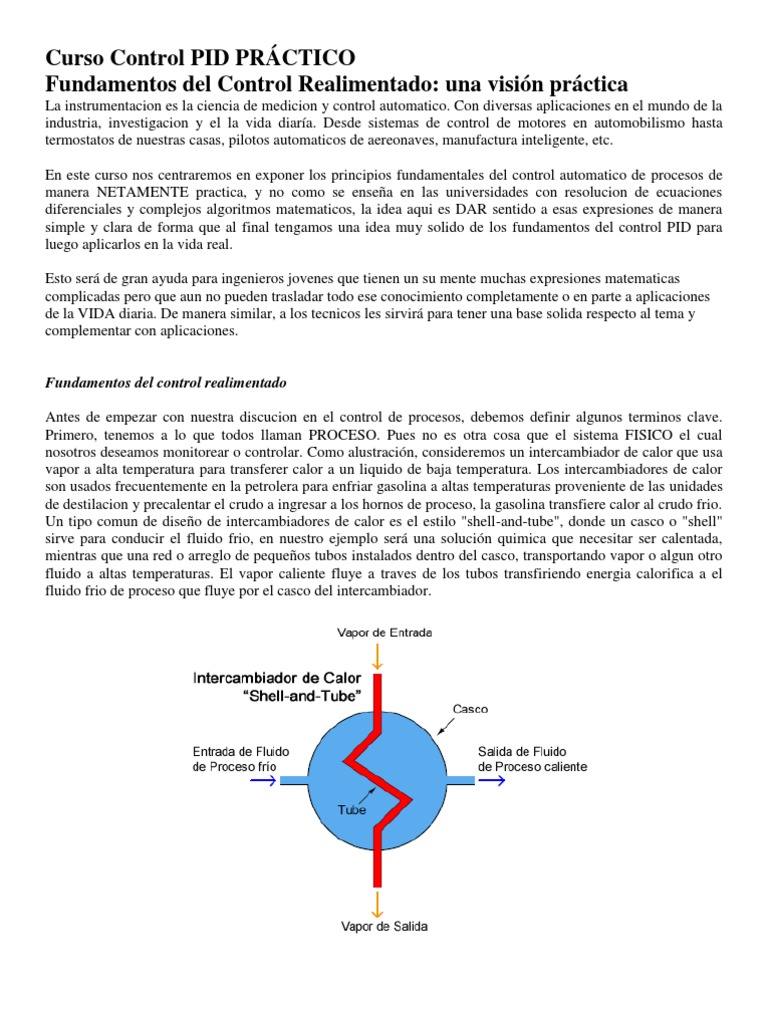 Fundamentos del control realimentado Antes de empezar con nuestra discucion en el control de procesos, debemos definir algunos terminos clave. Primero, tenemos a lo que todos llaman PROCESO. Pues no es otra cosa que el sistema FISICO el cual nosotros deseamos monitorear o controlar. Como alustracin, consideremos un intercambiador de calor que usa vapor a alta temperatura para transferer calor a un liquido de baja temperatura. Los intercambiadores de calor son usados frecuentemente en la petrolera para enfriar gasolina a altas temperaturas proveniente de las unidades de destilacion y precalentar el crudo a ingresar a los hornos de proceso, la gasolina transfiere calor al crudo frio. Un tipo comun de diseo de intercambiadores de calor es el estilo "shell-and-tube", donde un casco o "shell" sirve para conducir el fluido frio, en nuestro ejemplo ser una solucin quimica que necesitar ser calentada, mientras que una red o arreglo de pequeos tubos instalados dentro del casco, transportando vapor o algun otro fluido a altas temperaturas. El vapor caliente fluye a traves de los tubos transfiriendo energia calorifica a el fluido frio de proceso que fluye por el casco del intercambiador.