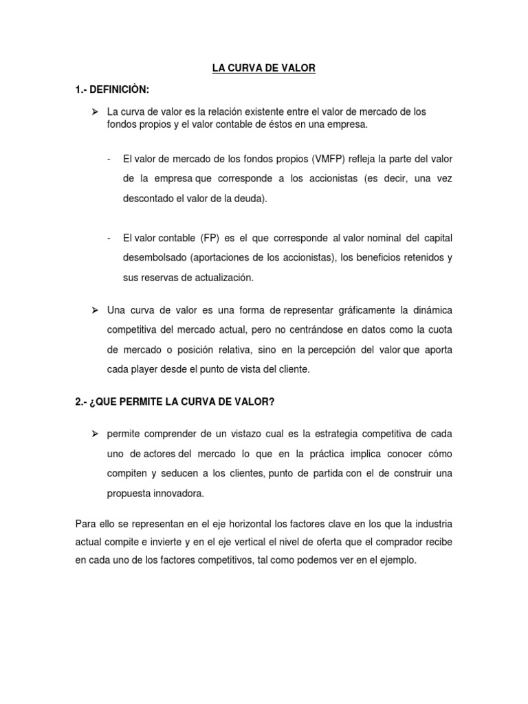 - DEFINICIN: La curva de valor es la relacin existente entre el valor de mercado de los fondos propios y el valor contable de stos en una empresa.