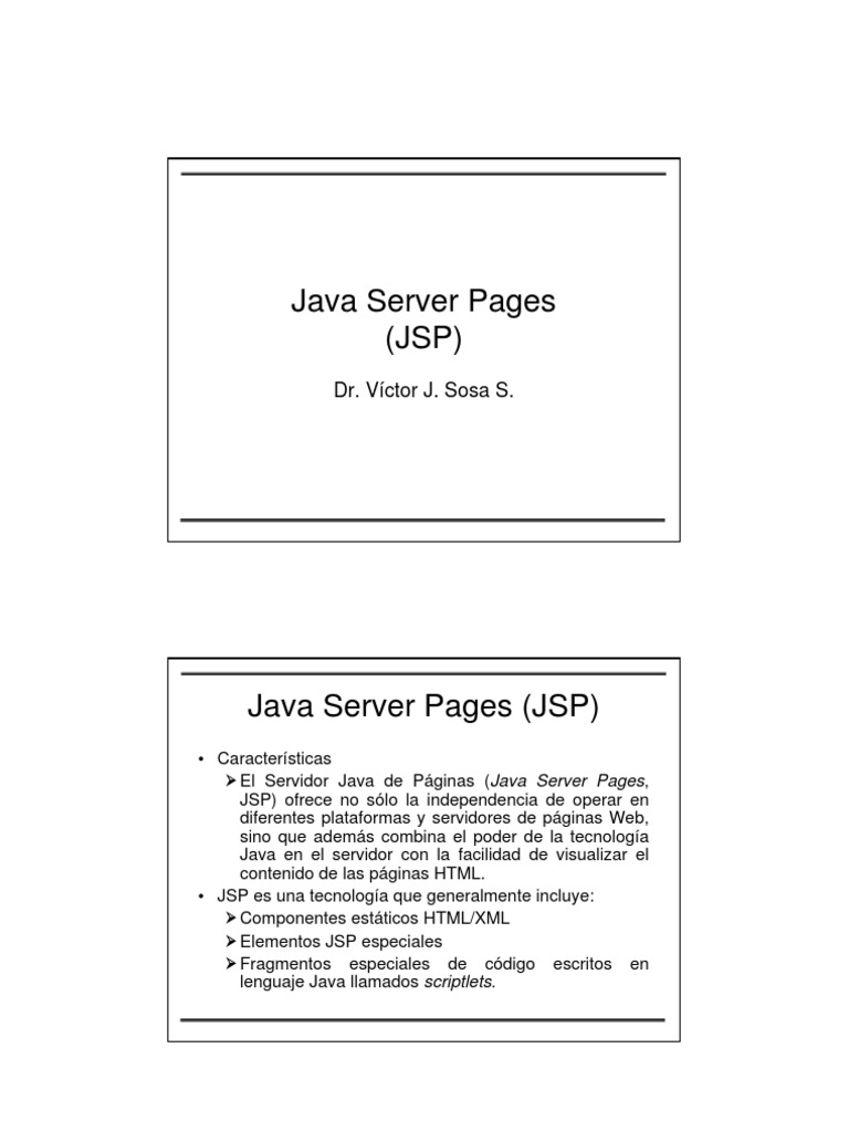 Caractersticas El Servidor Java de Pginas (Java Server Pages, JSP) ofrece no slo la independencia de operar en diferentes plataformas y servidores de pginas Web, sino que adems combina el poder de la tecnologa Java en el servidor con la facilidad de visualizar el contenido de las pginas HTML. JSP es una tecnologa que generalmente incluye: Componentes estticos HTML/XML Elementos JSP especiales Fragmentos especiales de cdigo escritos en lenguaje Java llamados scriptlets.