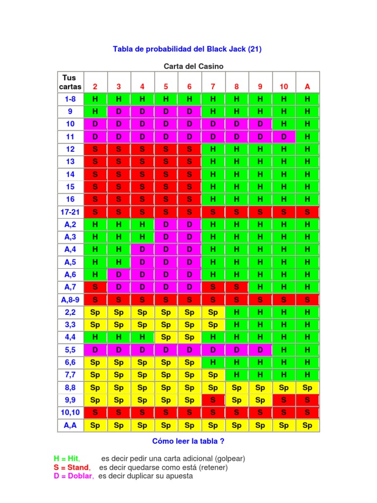 Cmo leer la tabla ? H = Hit, es decir pedir una carta adicional (golpear) S = Stand, es decir quedarse como est (retener) D = Doblar, es decir duplicar su apuesta