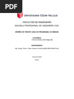Este proyecto consiste en el diseo estructural de un puente de cincuenta y siete (57) metros de longitud. En esta memoria de clculo se presentan los procedimientos que se utilizaron en el diseo estructural del puente, con ayuda del programa de anlisis y diseo CSI Bridge, de las cuales las pautas a seguir en este proyecto que son: