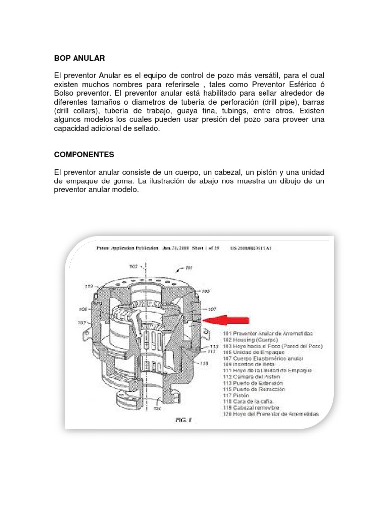 COMPONENTES El preventor anular consiste de un cuerpo, un cabezal, un pistn y una unidad de empaque de goma. La ilustracin de abajo nos muestra un dibujo de un preventor anular modelo.