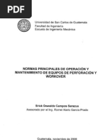 INSPECCION, TESTEO Y MANTENIMIENTO 1. Inspeccin visual La inspeccin visual tiene que ser llevada a cabo peridicamente y siempre que se reemplacen los rams (Reglamento API RP 53). Chequear el desgaste y los posibles daos donde el sello est ms sujeto a la friccin y chequear el sello mismo. Chequear las conexiones ram-vstago. Chequear las condiciones de los rams de los packers frontal y superior (desgaste, cortes, daos). Finalmente, chequear los asientos de los rams con especial cuidado la parte central superior donde trabaja el sello superior. Medir la distancia entre la parte superior del ram y su asiento para definir el juego vertical y lateral de acuerdo con las recomendaciones del fabricante. 1. Test de Operacin De acuerdo con el reglamento API RP 53 los tests de operacin del ram BOP deberan ser llevados a cabo en cada viaje, con una frecuencia mxima de un test al da. Tiene que llevarse a cabo. SISTEMAS ASEGURADORES DE RAM 1. SISTEMA MANUAL Es un sistema mecnico de seguro operado manualmente con una rueda. Despus de cerrar el BOP, se pueden asegurar manualmente los rams rotando la varilla en sentido de las agujas del reloj, hasta que la extensin anular en el tornillo alcance la superficie posterior del cilindro . La varilla se instala dentro del cilindro de trabajo y se sumerge en el fluido hidrulico. As la rosca est protegida y lubricada gracias al fluido operante, y protegida del clima, la corrosin y cualquier dao que pueda ocurrir durante el levantamiento del BOP. 2. SISTEMA AUTOMATICO (POSLOCK) Se efecta siempre que se estn cerrando los rams, garantizando el seguro del BOP aun cuando la presin es liberada. El poslock de SISTEMA AUTOMATICO (POSLOCK) apertura/cierre se lleva a cabo a travs del mismo mecanismo que el de apertura/cierre de rams (No hay sistemas hidrulicos adicionales) y es causado