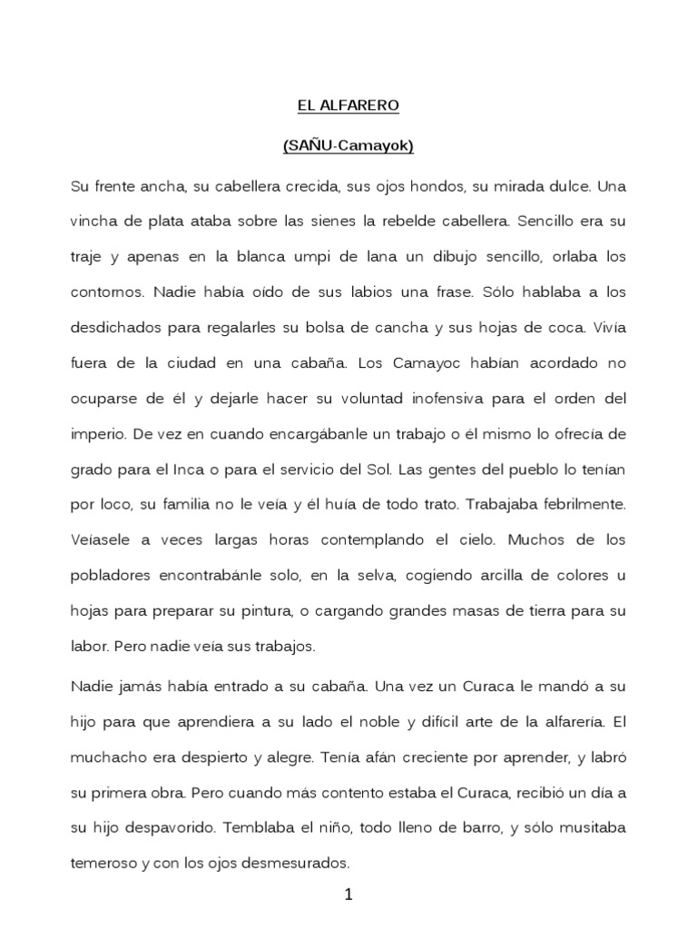 Una vincha de plata ataba sobre las sienes la rebelde cabellera. Sencillo era su traje y apenas en la blanca umpi de lana un dibujo sencillo, orlaba los contornos. Nadie haba odo de sus labios una frase. Slo hablaba a los desdichados para regalarles su bolsa de cancha y sus hojas de coca. Viva fuera de la ciudad en una cabaa. Los Camayoc haban acordado no ocuparse de l y dejarle hacer su voluntad inofensiva para el orden del imperio. De vez en cuando encargbanle un trabajo o l mismo lo ofreca de grado para el Inca o para el servicio del Sol. Las gentes del pueblo lo tenan por loco, su familia no le vea y l hua de todo trato. Trabajaba febrilmente. Veasele a veces largas horas contemplando el cielo. Muchos de los pobladores encontrabnle solo, en la selva, cogiendo arcilla de colores u hojas para preparar su pintura, o cargando grandes masas de tierra para su labor. Pero nadie vea sus trabajos. Nadie jams haba entrado a su cabaa. Una vez un Curaca le mand a su hijo para que aprendiera a su lado el noble y difcil arte de la alfarera. El muchacho era despierto y alegre. Tena afn creciente por aprender, y labr su primera obra. Pero cuando ms contento estaba el Curaca, recibi un da a su hijo despavorido. Temblaba el nio, todo lleno de barro, y slo musitaba temeroso y con los ojos desmesurados.