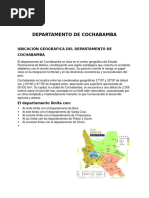 INDICE 1.- Panorama geogrfico de Cochabamba. Antologa geogrfica. 2.- Proceso histrico de Cochabamba. Antologa histrica. 3.- Vida institucional de Cochabamba. 4.- Instruccin Pblica en Cochabamba. 5.- Resea cultural de Cochabamba.