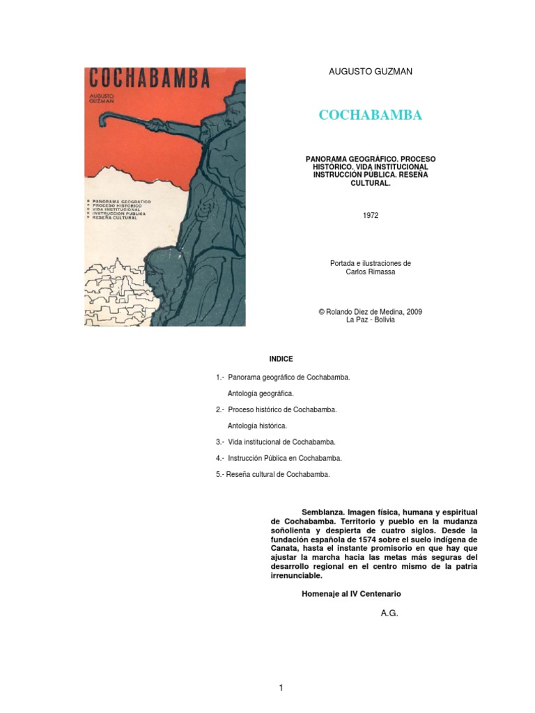 Semblanza. Imagen fsica, humana y espiritual de Cochabamba. Territorio y pueblo en la mudanza soolienta y despierta de cuatro siglos. Desde la fundacin espaola de 1574 sobre el suelo indgena de Canata, hasta el instante promisorio en que hay que ajustar la marcha hacia las metas ms seguras del desarrollo regional en el centro mismo de la patria irrenunciable. Homenaje al IV Centenario