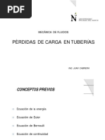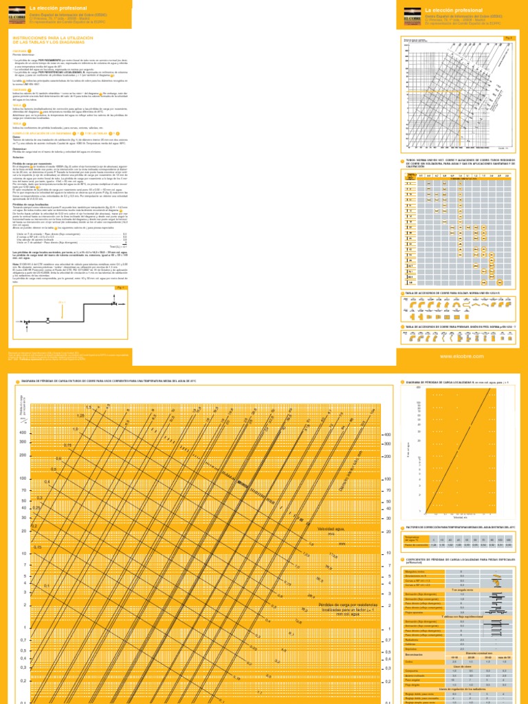 DIAGRAMA 1 Permite determinar: La prdida de carga POR ROZAMIENTO por metro lineal de tubo recto en servicio normal (es decir, despus de un cierto tiempo de estar en uso, expresada en milmetros de columna de agua y referida a una temperatura media del agua de 45; La velocidad del agua en los tubos, expresada en metros por segundo; La prdida de carga POR RESISTENCIAS LOCALIZADAS, H, expresada en milmetros de columna de agua, y para un coeficente de prdidas localizadas = 1 (ver tambin el diagrama 2 ). La tabla 5 indica las principales caractersticas de los tubos de cobre para los dimetros recogidos en la norma UNE-EN 1057. DIAGRAMA 2 Indica los valores de H, tambin obtenibles como se ha visto del diagrama 1 .Sin embargo, este diagrama permite una ms fcil determinacin del valor de H para todos los valores normales de la velocidad del agua en los tubos. TABLA 3 Indica los factores (multiplicadores) de correccin para aplicar a las prdidas de carga por rozamiento, obtenidas del diagrama 1 ,para temperatura medias del agua diferentes de 45C. Advirtase que, en la prctica, la temperatura del agua no influye sobre los valores de las prdidas de carga por reistencias localizadas. TABLA 4 Indica los coeficientes de prdida localizada para curvas, uniones, vlvulas, etc. EJEMPLO DE APLICACIN DE LOS DIAGRAMAS 1 Y 2 Y DE LAS TABLAS 3 Y 4 P