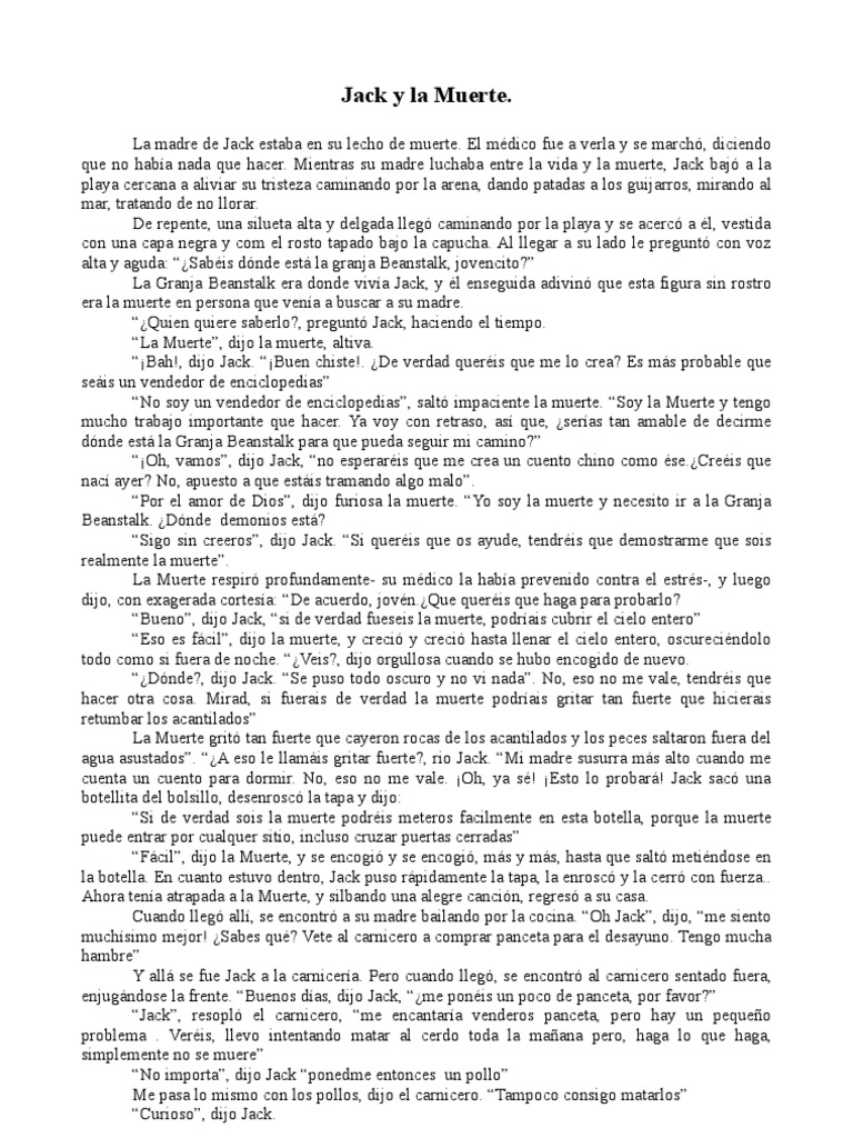 La madre de Jack estaba en su lecho de muerte. El mdico fue a verla y se march, diciendo que no haba nada que hacer. Mientras su madre luchaba entre la vida y la muerte, Jack baj a la playa cercana a aliviar su tristeza caminando por la arena, dando patadas a los guijarros, mirando al mar, tratando de no llorar. De repente, una silueta alta y delgada lleg caminando por la playa y se acerc a l, vestida con una capa negra y com el rosto tapado bajo la capucha. Al llegar a su lado le pregunt con voz alta y aguda: Sabis dnde est la granja Beanstalk, jovencito? La Granja Beanstalk era donde viva Jack, y l enseguida adivin que esta figura sin rostro era la muerte en persona que vena a buscar a su madre. Quien quiere saberlo?, pregunt Jack, haciendo el tiempo. La Muerte, dijo la muerte, altiva. Bah!, dijo Jack. Buen chiste!. De verdad queris que me lo crea? Es ms probable que seis un vendedor de enciclopedias No soy un vendedor de enciclopedias, salt impaciente la muerte. Soy la Muerte y tengo mucho trabajo importante que hacer. Ya voy con retraso, as que, seras tan amable de decirme dnde est la Granja Beanstalk para que pueda seguir mi camino? Oh, vamos, dijo Jack, no esperaris que me crea un cuento chino como [Link] que nac ayer? No, apuesto a que estis tramando algo malo. Por el amor de Dios, dijo furiosa la muerte. Yo soy la muerte y necesito ir a la Granja Beanstalk. Dnde demonios est? Sigo sin creeros, dijo Jack. Si queris que os ayude, tendris que demostrarme que sois realmente la muerte. La Muerte respir profundamente- su mdico la haba prevenido contra el estrs-, y luego dijo, con exagerada cortesa: De acuerdo, [Link] queris que haga para probarlo? Bueno, dijo Jack, si de verdad fueseis la muerte, podrais cubrir el cielo entero Eso es fcil, dijo la muerte, y creci y creci hasta llenar el cielo entero, oscurecindolo todo como si fuera de noche. Veis?, dijo orgullosa cuando se hubo encogido de nuevo. Dnde?, dijo Jack. Se puso todo oscuro y no vi nada. No, eso no me vale, tendris que hacer otra cosa. Mirad, si fuerais de verdad la muerte podrais gritar tan fuerte que hicierais retumbar los acantilados La Muerte grit tan fuerte que cayeron rocas de los acantilados y los peces saltaron fuera del agua asustados. A eso le llamis gritar fuerte?, rio Jack. Mi madre susurra ms alto cuando me cuenta un cuento para dormir. No, eso no me vale. Oh, ya s! Esto lo probar! Jack sac una botellita del bolsillo, desenrosc la tapa y dijo: Si de verdad sois la muerte podris meteros facilmente en esta botella, porque la muerte puede entrar por cualquer sitio, incluso cruzar puertas cerradas Fcil, dijo la Muerte, y se encogi y se encogi, ms y ms, hasta que salt metindose en la botella. En cuanto estuvo dentro, Jack puso rpidamente la tapa, la enrosc y la cerr con fuerza.. Ahora tena atrapada a la Muerte, y silbando una alegre cancin, regres a su casa. Cuando lleg all, se encontr a su madre bailando por la cocina. Oh Jack, dijo, me siento muchsimo mejor! Sabes qu? Vete al carnicero a comprar panceta para el desayuno. Tengo mucha hambre Y all se fue Jack a la carnicera. Pero cuando lleg, se encontr al carnicero sentado fuera, enjugndose la frente. Buenos das, dijo Jack, me ponis un poco de panceta, por favor? Jack, resopl el carnicero, me encantara venderos panceta, pero hay un pequeo problema . Veris, llevo intentando matar al cerdo toda la maana pero, haga lo que haga, simplemente no se muere No importa, dijo Jack ponedme entonces un pollo Me pasa lo mismo con los pollos, dijo el carnicero. Tampoco consigo matarlos Curioso, dijo Jack.