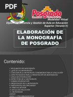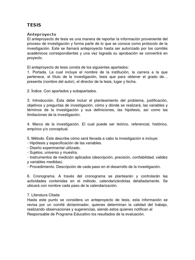 Anteproyecto El anteproyecto de tesis es una manera de reportar la informacin proveniente del proceso de investigacin y forma parte de lo que se conoce como protocolo de la investigacin. Este se llamar anteproyecto hasta ser autorizado por los comits acadmicos correspondientes y una vez lograda su aprobacin se convertir en proyecto. El anteproyecto de tesis consta de los siguientes apartados: 1. Portada. La cual incluye el nombre de la institucin, la carrera a la que pertenece, el ttulo de la investigacin, tesis que para obtener el grado de presenta (nombre del autor), el director de la tesis, lugar y fecha. 2. ndice. Con apartados y subapartados. 3. Introduccin. sta debe incluir el planteamiento del problema, justificacin, objetivos y preguntas de investigacin, cmo y dnde se realizar, las variables y trminos de la investigacin y sus definiciones, las hiptesis, as como las limitaciones de la investigacin. 4. Marco de la investigacin. El cual puede ser terico, referencial, histrico, emprico y/o conceptual. 5. Mtodo. ste describe cmo ser llevada a cabo la investigacin e incluye: - Hiptesis y especificacin de las variables. - Diseo experimental utilizado. - Sujetos, universo y muestra. - Instrumentos de medicin aplicados (descripcin, precisin, confiabilidad, validez y variables medidas). - Procedimiento. Descripcin de cada paso en el desarrollo de la investigacin. 6. Cronograma. A travs del cronograma se plantearn y controlarn las actividades contenidas en el mtodo, calendarizndolas detalladamente. Se ubicar con nombre cada paso de la calendarizacin. 7. Literatura Citada Hasta este punto se considera un anteproyecto de tesis, esta informacin se revisa por un comit dictaminador, quienes determinan la calidad del trabajo, realizando observaciones y sugerencias, siendo estos quienes notifican al Responsable de Programa Educativo los resultados de la evaluacin.