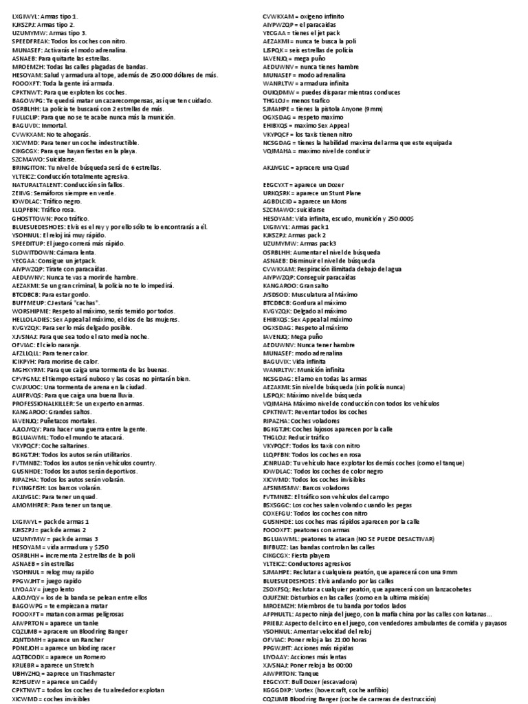 MUNASEF: Activars el modo adrenalina. ASNAEB: Para quitarte las estrellas. MROEMZH: Todas las calles plagadas de bandas. HESOYAM: Salud y armadura al tope, adems de 250.000 dlares de ms. FOOOXFT: Toda la gente ir armada. CPKTNWT: Para que exploten los coches. BAGOWPG: Te quedr matar un cazarecompensas, as que ten cuidado. OSRBLHH: La policia te buscar con 2 estrellas de ms. FULLCLIP: Para que no se te acabe nunca ms la municin. BAGUVIX: Inmortal. CVWKXAM: No te ahogars. XICWMD: Para tener un coche indestructible. CIKGCGX: Para que hayan fiestas en la playa. SZCMAWO: Suicidarse. BRINGITON: Tu nivel de bsqueda ser de 6 estrellas. YLTEICZ: Conduccin totalmente agresiva. NATURALTALENT: Conduccin sin fallos. ZEIIVG: Semforos siempre en verde. IOWDLAC: Trfico negro. LLQPFBN: Trfico rosa. GHOSTTOWN: Poco trfico. BLUESUEDESHOES: Elvis es el rey y por ello slo te lo encontrars a l. YSOHNUL: El reloj ir muy rpido. SPEEDITUP: El juego correr ms rpido. SLOWITDOWN: Cmara lenta. YECGAA: Consigue un jetpack. AIYPWZQP: Tirate con paracadas. AEDUWNV: Nunca te vas a morir de hambre. AEZAKMI: Se un gran criminal, la policia no te lo impedir. BTCDBCB: Para estar gordo. BUFFMEUP: CJ estar "cachas". WORSHIPME: Respeto al mximo, sers temido por todos. HELLOLADIES: Sex Appeal al mximo, el dios de las mujeres. KVGYZQK: Para ser lo ms delgado posible. XJVSNAJ: Para que sea todo el rato media noche. OFVIAC: El cielo naranja. AFZLLQLL: Para tener calor. ICIKPYH: Para morirse de calor. MGHXYRM: Para que caiga una tormenta de las buenas. CFVFGMJ: El tiempo estar nuboso y las cosas no pintarn bien. CWJXUOC: Una tormenta de arena en la ciudad. AUIFRVQS: Para que caiga una buena lluvia. PROFESSIONALKILLER: Se un experto en armas. KANGAROO: Grandes saltos. IAVENJQ: Puetazos mortales. AJLOJYQY: Para hacer una guerra entre la gente. BGLUAWML: Todo el mundo te atacar. VKYPQCF: Coche saltarines. BGKGTJH: Todos los autos sern utilitarios. FVTMNBZ: Todos los autos sern vehculos country. GUSNHDE: Todos los autos sern deportivos. RIPAZHA: Todos los autos sern volarn. FLYINGFISH: Los barcos volarn. AKJJYGLC: Para tener un quad. AMOMHRER: Para tener un tanque. LXGIWYL = pack de armas 1 KJKSZPJ = pack de armas 2 UZUMYMW = pack de armas 3 HESOYAM = vida armadura y $250 OSRBLHH = incrementa 2 estrellas de la poli ASNAEB = sin estrellas YSOHNUL = relog muy rapido PPGWJHT = juego rapido LIYOAAY = juego lento AJLOJYQY = los de la banda se pelean entre ellos BAGOWPG = te empiezan a matar FOOOXFT = matan con armas peligrosas AIWPRTON = aparece un tanke CQZIJMB = apracere un Bloodring Banger JQNTDMH = aparece un Rancher PDNEJOH = aparece un bloding racer AQTBCODX = aparece un Romero KRIJEBR = aparece un Stretch UBHYZHQ = aaprece un Trashmaster RZHSUEW = aparece un Caddy CPKTNWT = todos los coches de tu alrededor explotan XICWMD = coches invisibles SZCMAWO = Suicidio YLTEICZ = contuctores agresivos LLQPFBN = trafico rosa IOWDLAC = trafico negro AFSNMSMW = botes vuelan BTCDBCB =gordo JYSDSOD = musculos al maximo KVGYZQK = cambia la ropa BGLUAWML = sorpresaaaaa CIKGCGX = fiesta en la playa RIPAZHA = los coches vuelan JUMPJET = aparece un Hydra KGGGDKP = aparece un Vortex Hovercraft JCNRUAD = coches se vuelcan facil COXEFGU = todos los coches tiene nitro BSXSGGC = los vehiculos flotan al tocarlo con tu coche BAGUVIX = vida infinita