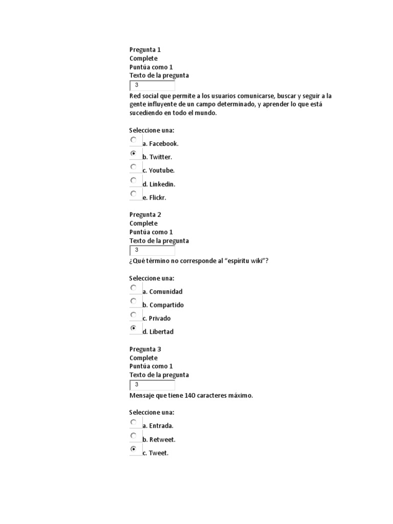 Seleccione una: a. Facebook. b. Web 2.0 c. Redes Sociales. d. Twitter. e. Ninguna de las anteriores. Pregunta 17 Complete Punta como 1 Texto de la pregunta