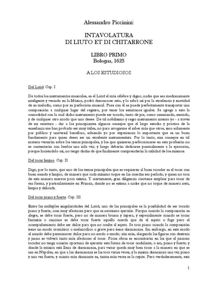 Del Lad. Cap. I De todos los instrumentos musicales, es el Lad el ms clebre y digno; nadie que sea medianamente inteligente y versado en la Msica, podr desconocer esto, y lo sabr as por la excelencia y suavidad de su meloda, como por su perfeccin musical. Pues con l se puede perfectamente transportar una composicin a cualquier lugar del registro, por tener los semitonos iguales. Se agrega a esto la comodidad con la cual dicho instrumento puede ser tocado, tanto de pie, como caminando, sentado, y de cualquier otro modo que uno desee. De tal nobilsimo y regio instrumento intento yo - a travs de mi escritura - dar a los principiantes algunos consejos que el largo estudio y prctica de la enseanza me han probado ser muy tiles, no para arrogarme el saber ms que otros, sino solamente por pblico y universal beneficio, sabiendo yo por experiencia lo importante que es un buen fundamento para quien desea ser un excelente instrumentista. Por lo tanto, mis consejos en tal materia versarn sobre los temas principales, y los que quisieren perfeccionarse en esta profesin no se contentarn con leerlos una sola vez; y luego debern dedicarse puntualmente a la ejecucin, porque hacindolo as, no tengo dudas de que finalmente comprendern la utilidad de los mismos. Del tocar limpio. Cap. II Digo, por lo tanto, que uno de los temas principales que se requieren al buen tocador es el tocar con buen sonido y limpio, de manera que cada mnimo toque en las cuerdas sea perlado, y quien no toca de esta manera merece poca estima. Y ciertamente, gran diligencia conviene emplear para tocar de esa forma, y particularmente en Francia, donde no se estima a nadie que no toque de manera neta, limpia y delicada. Del tocar piano y fuerte. Cap. III Entre las mltiples singularidades del Lad, una de las principales es la posibilidad de ser tocado piano y fuerte, cosa muy afectuosa pero que es necesario ejercitar. Porque cuando la composicin es alegre, se debe tocar fuerte, pero no de manera brusca y spera, y especialmente cuando se tocan fantasas o canzone se debe tocar fuerte aquella cuerda que da el sujeto o fuga pero el acompaamiento debe ser dulce para que no oculte al sujeto. Se toca piano cuando la composicin tiene un modo cromtico o melanclico o grave pero tiene disonancias. Sin embargo, en este modo el sonido debe permanecer dulce pero no sordo o mudo; an ms, alargando las figuras con destreza y juicio se volver tanto ms afectuoso el tocar. Pocas obras se encontrarn en las que el juicioso tocador no tenga ocasin oportuna de ejercitar esta forma de tocar ondulante, o sea, piano y fuerte; y donde la msica est llena de disonancias, para variar queda muy bien tocar a la manera en que se usa en Npoles, en que a las disonancias se las toca varias veces, y la misma disonancia una vez piano y una vez fuerte, y cuanto ms disonante es, tantas ms veces se la repite. Pero verdaderamente, esta 1