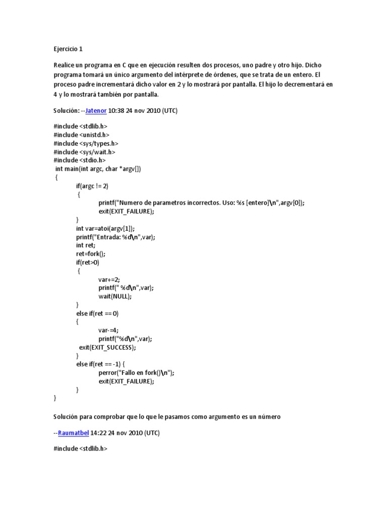 Dicho programa tomar un nico argumento del intrprete de rdenes, que se trata de un entero. El proceso padre incrementar dicho valor en 2 y lo mostrar por pantalla. El hijo lo decrementar en 4 y lo mostrar tambin por pantalla. Solucin: --Jatenor 10:38 24 nov 2010 (UTC) #include <stdlib.h> #include <unistd.h> #include <sys/types.h> #include <sys/wait.h> #include <stdio.h> int main(int argc, char *argv[]) { if(argc != 2) { printf("Numero de parametros incorrectos. Uso: %s [entero]\n",argv[0]); exit(EXIT_FAILURE); } int var=atoi(argv[1]); printf("Entrada: %d\n",var); int ret; ret=fork(); if(ret>0) { var+=2; printf(" %d\n",var); wait(NULL); } else if(ret == 0) { var-=4; printf("%d\n",var); exit(EXIT_SUCCESS); } else if(ret == -1) { perror("Fallo en fork()\n"); exit(EXIT_FAILURE); } } Solucin para comprobar que lo que le pasamos como argumento es un nmero --Raumatbel 14:22 24 nov 2010 (UTC) #include <stdlib.h>