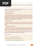 8.10. Consultas basadas en ms de una tabla Se crean de la misma forma que las anteriores, slo que a la hora de agregar tablas se puede agregar ms de una. De esta manera es posible reflejar las relaciones entre las tablas, y recuperar los registros relacionados de las dos tablas. De cada tabla se seleccionan los campos que se necesitan, arrastrndolos y pegndolos en las celdas de la consulta. Se agregan los criterios que se crean convenientes, de la misma manera que en las consultas basadas en una sola tabla. 8.11. Consultas avanzadas Hasta ahora la consulta que se ha visto ha sido la consulta de seleccin, una consulta muy sencilla. Para seleccionar otro tipo de consulta ms compleja se debe seleccionar el botn tipo de consulta: