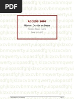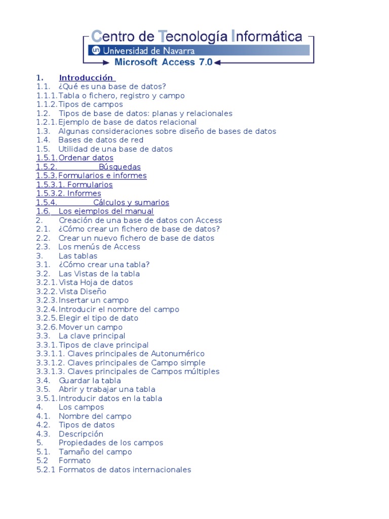 Tipos de base de datos: planas y relacionales 1.2.1. Ejemplo de base de datos relacional 1.3. Algunas consideraciones sobre diseo de bases de datos 1.4. Bases de datos de red 1.5. Utilidad de una base de datos 1.5.1. Ordenar datos 1.5.2. Bsquedas 1.5.3. Formularios e informes [Link]. Formularios [Link]. Informes 1.5.4. Clculos y sumarios 1.6. Los ejemplos del manual 2. Creacin de una base de datos con Access 2.1. Cmo crear un fichero de base de datos? 2.2. Crear un nuevo fichero de base de datos 2.3. Los mens de Access 3. Las tablas 3.1. Cmo crear una tabla? 3.2. Las Vistas de la tabla 3.2.1. Vista Hoja de datos 3.2.2. Vista Diseo 3.2.3. Insertar un campo 3.2.4. Introducir el nombre del campo 3.2.5. Elegir el tipo de dato 3.2.6. Mover un campo 3.3. La clave principal 3.3.1. Tipos de clave principal [Link]. Claves principales de Autonumrico [Link]. Claves principales de Campo simple [Link]. Claves principales de Campos mltiples 3.4. Guardar la tabla 3.5. Abrir y trabajar una tabla 3.5.1. Introducir datos en la tabla 4. Los campos 4.1. Nombre del campo 4.2. Tipos de datos 4.3. Descripcin 5. Propiedades de los campos 5.1. Tamao del campo 5.2 Formato 5.2.1 Formatos de datos internacionales