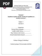 1.- ALGUNOS CONCEPTOS INTRODUCTORIOS De acuerdo a la regla de las fases de Gibbs, cuando observa una sola fase en un sistema de tres componentes como el que estudiaremos, los grados del libertad son 4 . Por lo tanto, para describirlo completamente habr que fijar 4 de las 5 variables del sistema (T, P y concentraciones de cada uno de los tres componentes). Como los grficos de tantas variables son muy difciles de interpretar, se elige mantener algunas de ellas constantes y graficar las restantes una contra otras. En nuestro caso se trabajar en condiciones de presin y temperatura constantes y se graficar el nmero de fases del sistema respecto de las concentraciones de sus tres componentes en un diagrama triangular, en unidades de porcentaje en masa. Para un sistema dado de tres componentes lquidos, existirn composiciones para las cuales la solubilidad es completa, resultando la mezcla en una sola fase. Entonces, a P y T cte., sern 2 los grados de libertad, debiendo establecerse dos de las tres concentraciones para describir completamente la situacin del sistema. Pero pueden darse composiciones en las cuales se supera la solubilidad y aparecen dos fases inmiscibles, cada una con los tres componentes en cierta proporcin. Nuestro objetivo es construir y aprender a manejar un diagrama ternario, determinando la curva de solubilidad del sistema ternario por titulacin hasta la aparicin desaparicin de dos fases. Esta curva lmite separa la zona de composiciones que dan un sistema monofsico de las que dan un sistema bifsico. Cmo leer el grfico: Los compuestos puros se ubican en los vrtices del tringulo. Los lados del tringulo representan composiciones de mezclas binarias entre pares de componentes (ej. : lnea AC % en masas de mezclas de A y C). Las lneas paralelas a un lado del tringulo representan las concentraciones del componente que se encuentra en el vrtice opuesto ( ej.: b y b respecto del componente B , desde el 0% de B en la linea AC hasta el 100% de B en el vrtice B)- Fig.1-