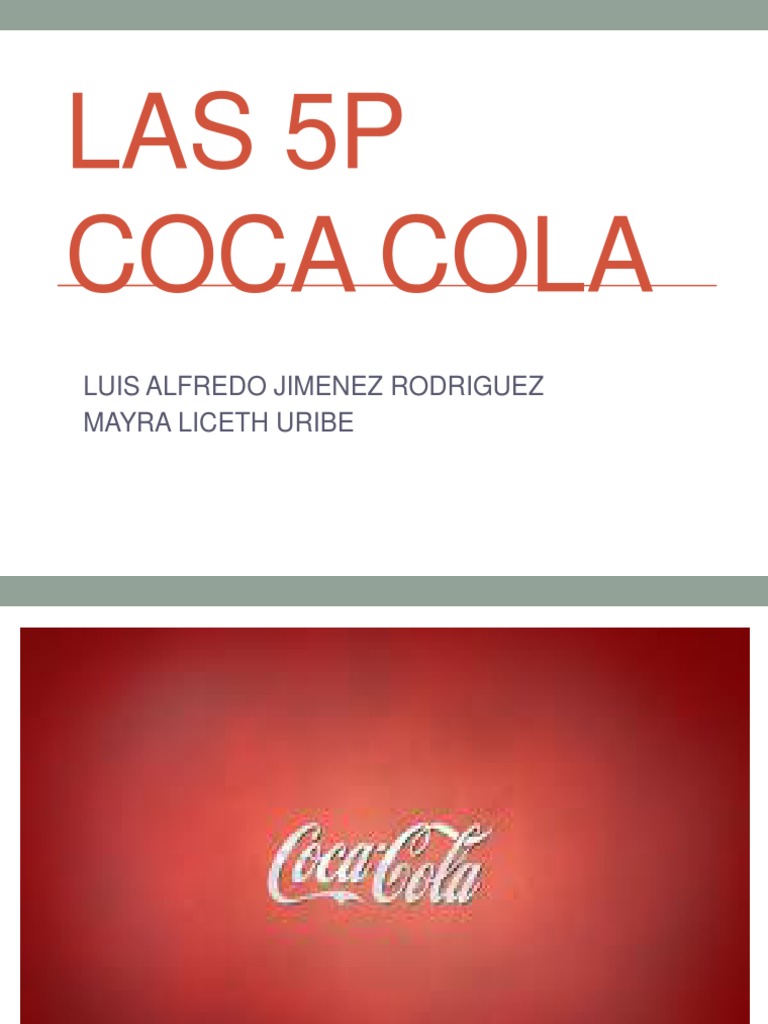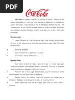 concebida el 8 de mayo de 1886 por el farmacutico John Pemberton como un medicamento para el cerebro y los nervios, y actualmente es una bebida carbonatada de varios sabores. Pero la coca-cola no promociona una bebida carbonatada de sabores, ni mucho menos un medicamente. Ellos venden: La chispa de la vida Esa chispa que no puede faltar en los momentos familiares. Esa chispa que te acompaa con tus amigos durante los encuentros de ftbol. La chispa que te ayuda a ser fliz Una eleccin que puedes hacer. Una de las cosas buenas de la vida.