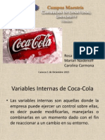 Promocin: Coca-cola no escatima en darse a conocer y permanecer en la mente de los consumidores. Desde sus orgenes registr su marca, patent su frmula y su envase con silueta de mujer. Invierte aproximadamente 5% de sus ventas en marketing. Hace publicidad en radio, televisin, patrocina eventos y equipos deportivos, utiliza enormemente la web, organiza desfiles, concursos, publica recetarios de cocina, se anuncia en espectaculares, bardas, tiendas. Utiliza y registra slogans. Innova siempre en lograr que su marca permanezca y sus ventas se incrementen. Ya tienes la frmula de negocio de la CocaCola. Debido a su xito a nivel mundial, en mayo de 1954 fue el primer producto en aparecer en la revista Time.