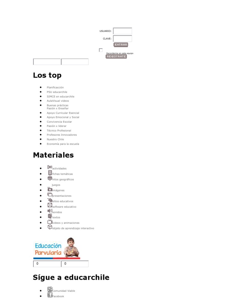 Planificaccin PSU educarchile SIMCE en educarchile AulaVisual videos Buenas prcticas Pasin x Ensear Apoyo Curricular Esencial Apoyo Emocional y Social Convivencia Escolar Pasin x liderar Tcnico Profesional Profesores Innovadores Nuestro Chile Economa para la escuela