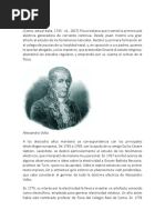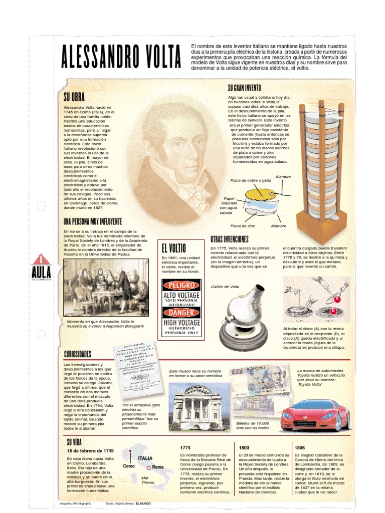 Alessandro Volta naci en 1745 en Como (Italia), en el seno de una familia noble. Recibi una educacin bsica de caractersticas humanistas, pero al llegar a la enseanza superior opt por una formacin cientfica. Este fsico italiano revolucion con sus inventos el uso de la electricidad. El mayor de ellos, la pila, sirvi de base para otros muchos descubrimientos cientficos como el electromagnetismo o la electrlisis y obtuvo por todo ello el reconocimiento de sus colegas. Pas sus ltimos aos en su hacienda en Camnago, cerca de Como, donde muri en 1827.