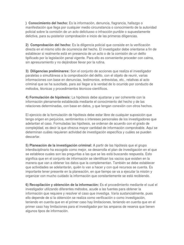 de la autoridad policial sobre la comisin de un acto delictuoso o infraccin punible o supuestamente delictiva, para su posterior comprobacin e inicio de las primeras diligencias. 2) Comprobacin del hecho: Es la diligencia policial que consiste en la verificacin directa en el mismo sitio de ocurrencia del hecho. El investigador debe orientarse a fin de establecer si realmente est en presencia de un acto o de la comisin de un delito tipificado por la legislacin penal vigente. Para ello es conveniente proceder con calma, sin apresuramiento y no dejndose llevar por la rutina. 3) Diligencias preliminares: Son el conjunto de acciones que realiza el investigador paralelas o simultneas a la comprobacin del delito, con el objeto de reunir, varias informaciones con base en denuncias, testimonios, entrevistas, etc., relativas al acto criminal que se ha suscitado, para as llegar a la verdad de lo ocurrido por conducto de mtodos, tcnicas y procedimientos tcnicos-cientficos. 4) Formulacin de hiptesis: La hiptesis debe ajustarse y ser coherente con la informacin plenamente establecida mediante el conocimiento del hecho y de las relaciones determinadas, con base en datos, y que tengan conexin con otros hechos. El ejercicio de la formulacin de hiptesis debe estar libre de cualquier suposicin que tenga origen en perjuicios, sentimientos o intereses personales de los investigadores que adelantan el caso. Formuladas las hiptesis, se ordenan de acuerdo con el grado de complejidad, es decir la que ofrezca mayor cantidad de informacin comprobable. Aqu se determinan cules requieren actividad de investigacin especfica y cules se pueden descartar. 5) Planeacin de la investigacin criminal: A partir de las hiptesis que el grupo interdisciplinario ha escogido como mejor, se desarrolla el plan de investigacin en el que se establece cuales son las preguntas a las que se les est buscando respuesta. Esto significa que en el conjunto de informacin se identifican los vacos que existen en la manera que van a obtener los datos que la complementan. Tambin se debe establecer que actividades se adelantarn, quin lo van a hacer y con qu recursos se cuenta. Es importante tener presente en la planeacin, en que tiempo se va a ejecutar la misin y organizar con mucho cuidado la informacin que constantemente se est recibiendo. 6) Recopilacin y obtencin de la informacin: Es el procedimiento mediante el cual el investigador utilizando diferentes mtodos, acude a las fuentes para obtener la informacin que requiere y resolver el caso que investiga. Vara sustancialmente, pues ello depende de si la obtencin se realiza como verificacin o como investigacin, teniendo en cuenta que en el primer caso hay limitaciones, teniendo en cuenta que en el primer caso hay limitaciones para el investigador por los amparos de reserva que tienen algunos tipos de informacin.