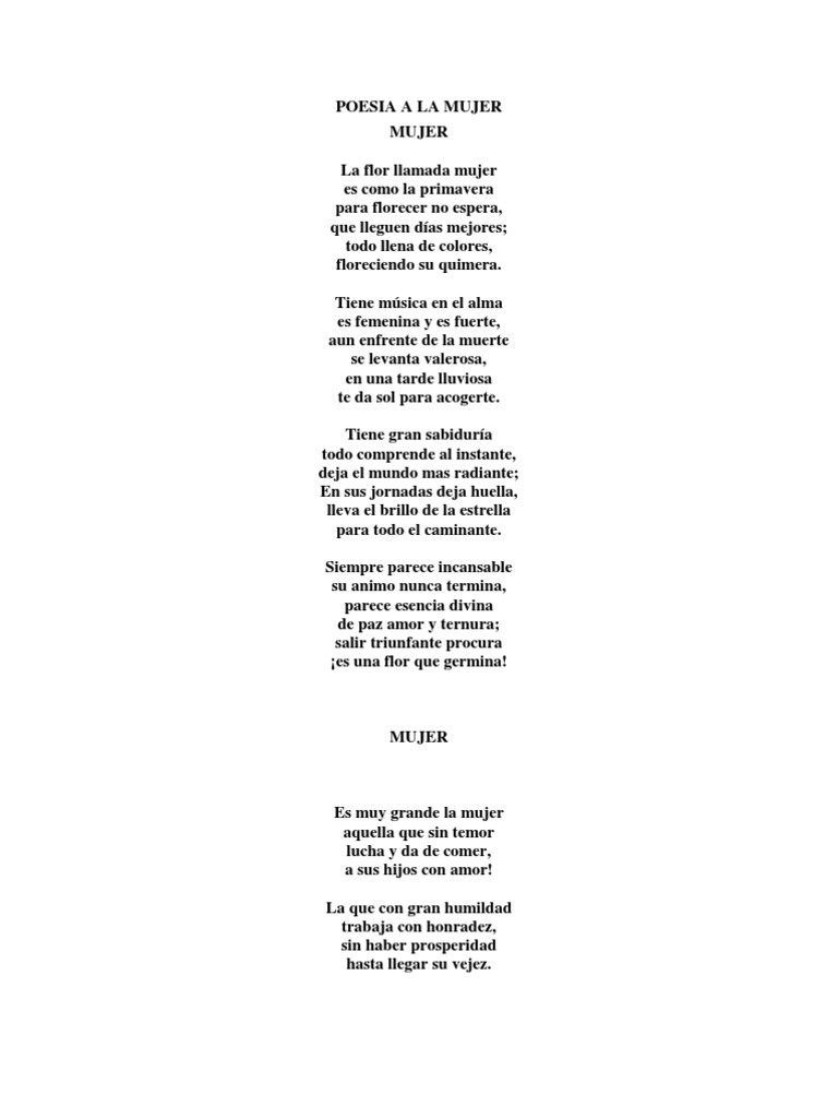 POESIA A LA MUJER MUJER La flor llamada mujer es como la primavera para florecer no espera, que lleguen das mejores;