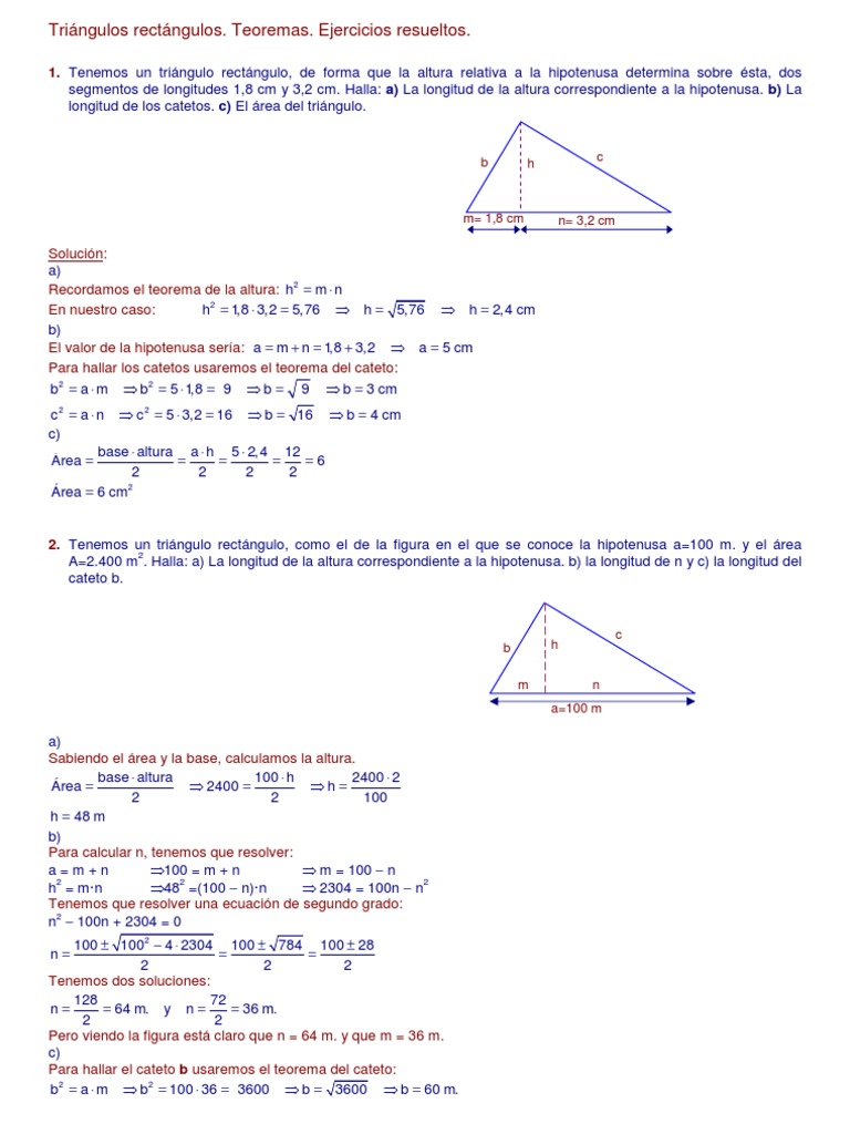 A=2.400 m . Halla: a) La longitud de la altura correspondiente a la hipotenusa. b) la longitud de n y c) la longitud del
