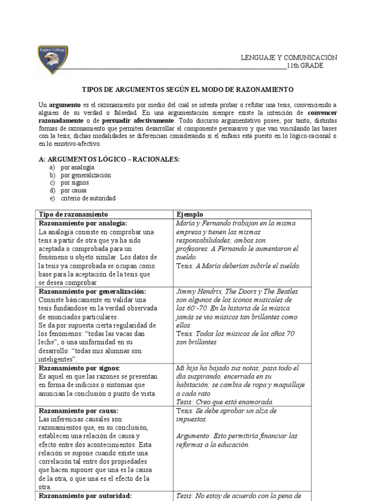 LENGUAJE Y COMUNICACIN _____________________________________________________________________11th GRADE TIPOS DE ARGUMENTOS SEGN EL MODO DE RAZONAMIENTO Un argumento es el razonamiento por medio del cual