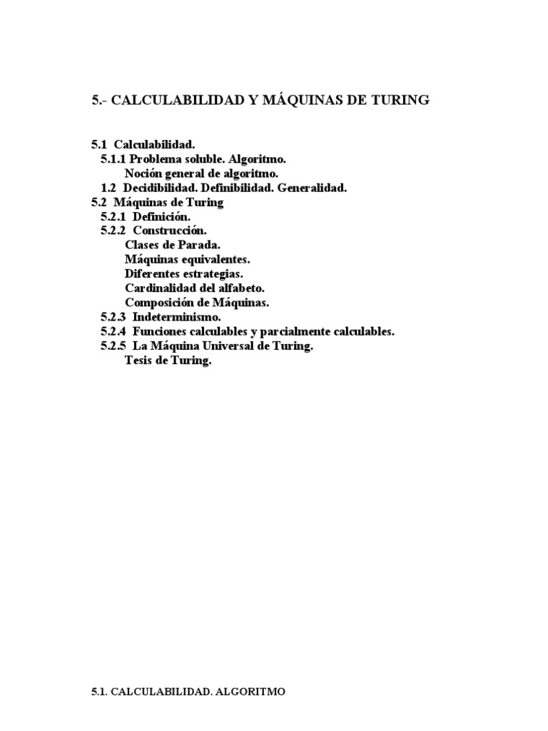 Otros itinerarios corresponden al clculo de f (x) = 2, 3, etc Pero en general, puede ser un rbol cualquiera. Si la mquina est bien construida, para un ejemplar (instance), cada itinerario del rbol conduce a un resultado en general diferente del de los dems itinerarios. Con esta perspectiva uno se puede preguntar si el indeterminismo posibilita el clculo de funciones que no pueden ser calculadas con mquinas deterministas. La respuesta es NO, porque una funcin calculable asigna un valor (nico) del rango a cada n-upla (entrada) del dominio para la que exista solucin. Cada itinerario de una mquina indeterminista corresponde al clculo de una determinista. En AF y AP es clara la utilidad que tiene construir autmatas finitos no deterministas para facilitar la construccin de los autmatas deterministas correspondientes. Igualmente el concepto es til en MT. Tiene aplicacin, [Link]., asociado al clculo de funciones parcialmente calculables, como vamos a ver. 5.2. 4 FUNCIONES CALCULABLES Y PARCIALMENTE CALCULABLES Una funcin definida en un dominio es totalmente calculable cuando existe una MT que calcula la funcin en todos los puntos del dominio; es decir, para cualquier posible entrada hay un clculo finito que termina cuando la mquina obtiene el resultado y queda parada. Es parcialmente calculable cuando existe una MT tal que calcula la funcin para algunos puntos del dominio y para los dems no hay clculo finito con parada. Ejemplos: - f : N x N N, f (x1, x2) = x1 - x2 tiene solucin para las parejas de enteros no negativos que cumplen x1 x2. - f : N x N R, f (x1, x2) = x1/x2 tiene solucin en el campo de los nos racionales (x1, x2 enteros, excepto x2 = 0). Est definida para un subconjunto de parejas de enteros, pero no para otras : 2/3, 1/7, ... A travs del enfoque de las MT, se define algoritmo, como "el procedimiento definido por la mquina de Turing que calcula una funcin parcialmente calculable". Hay que tener en cuenta que el conjunto de las funciones totalmente calculables es un subconjunto de las funciones parcialmente calculables. Esta definicin de algoritmo es equivalente a la hiptesis fundamental de la Teora de Algoritmos: "Cualquier algoritmo puede ser definido por un esquema funcional de Turing y realizado en la MT correspondiente". Esta definicin de algoritmo se apoya en el hecho de que no se ha podido definir ninguna funcin calculable que no pueda ser calculada por una mquina de Turing. El algoritmo, en el caso de funcin parcialmente calculable, debe detectar que, para esa entrada de datos particular, el problema tiene solucin, calcularla y parar. Tambin debe detectar cundo no existe solucin y parar, avisando de la ausencia de solucin. Si no se hace esa deteccin, la mquina no parara cuando no hay solucin. Indeterminismo y funciones parcialmente calculables: En el caso de funciones parcialmente calculables, la MT debera elegir: a) no hacer nada 15