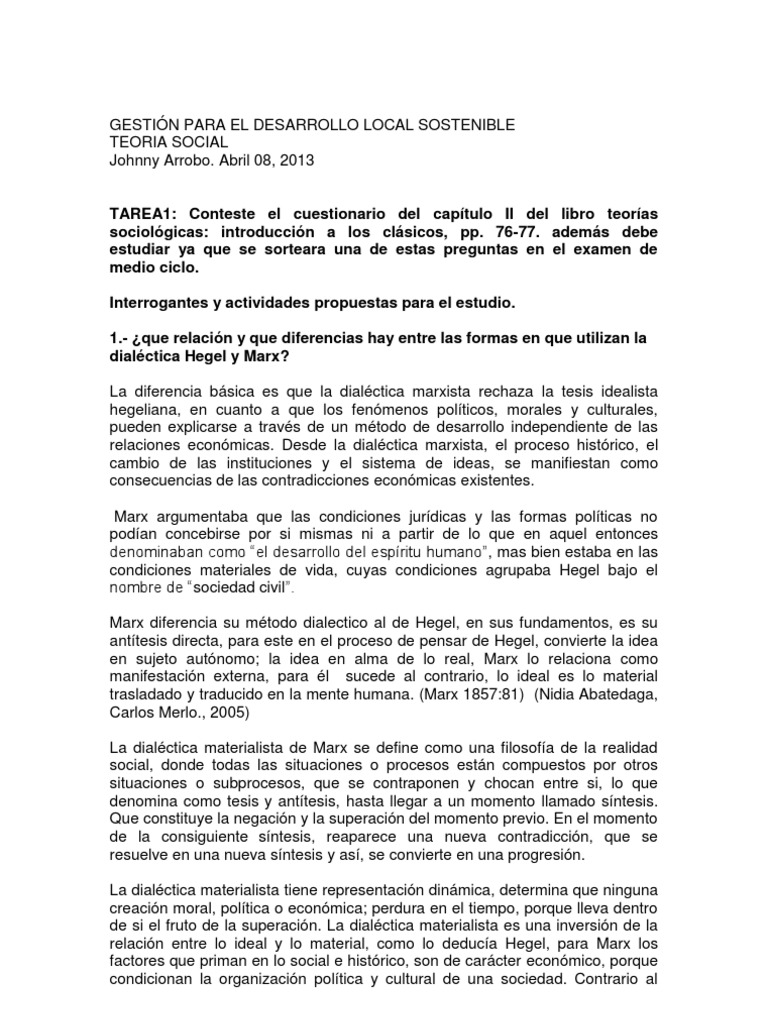 TAREA1: Conteste el cuestionario del captulo II del libro teoras sociolgicas: introduccin a los clsicos, pp. 76-77. adems debe estudiar ya que se sorteara una de estas preguntas en el examen de medio ciclo. Interrogantes y actividades propuestas para el estudio. 1.- que relacin y que diferencias hay entre las formas en que utilizan la dialctica Hegel y Marx? La diferencia bsica es que la dialctica marxista rechaza la tesis idealista hegeliana, en cuanto a que los fenmenos polticos, morales y culturales, pueden explicarse a travs de un mtodo de desarrollo independiente de las relaciones econmicas. Desde la dialctica marxista, el proceso histrico, el cambio de las instituciones y el sistema de ideas, se manifiestan como consecuencias de las contradicciones econmicas existentes. Marx argumentaba que las condiciones jurdicas y las formas polticas no podan concebirse por si mismas ni a partir de lo que en aquel entonces denominaban como el desarrollo del espritu humano, mas bien estaba en las condiciones materiales de vida, cuyas condiciones agrupaba Hegel bajo el nombre de sociedad civil. Marx diferencia su mtodo dialectico al de Hegel, en sus fundamentos, es su anttesis directa, para este en el proceso de pensar de Hegel, convierte la idea en sujeto autnomo; la idea en alma de lo real, Marx lo relaciona como manifestacin externa, para l sucede al contrario, lo ideal es lo material trasladado y traducido en la mente humana. (Marx 1857:81) (Nidia Abatedaga, Carlos Merlo., 2005) La dialctica materialista de Marx se define como una filosofa de la realidad social, donde todas las situaciones o procesos estn compuestos por otros situaciones o subprocesos, que se contraponen y chocan entre si, lo que denomina como tesis y anttesis, hasta llegar a un momento llamado sntesis. Que constituye la negacin y la superacin del momento previo. En el momento de la consiguiente sntesis, reaparece una nueva contradiccin, que se resuelve en una nueva sntesis y as, se convierte en una progresin. La dialctica materialista tiene representacin dinmica, determina que ninguna creacin moral, poltica o econmica; perdura en el tiempo, porque lleva dentro de si el fruto de la superacin. La dialctica materialista es una inversin de la relacin entre lo ideal y lo material, como lo deduca Hegel, para Marx los factores que priman en lo social e histrico, son de carcter econmico, porque condicionan la organizacin poltica y cultural de una sociedad. Contrario al