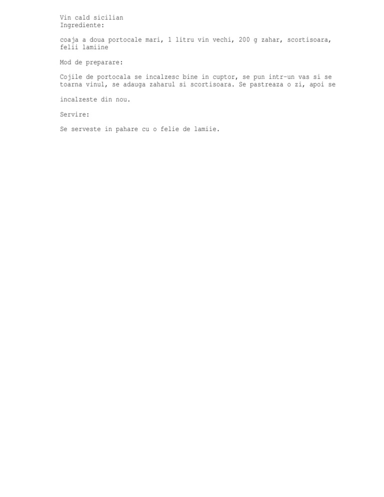 Vin cald sicilian Ingrediente: coaja a doua portocale mari, 1 litru vin vechi, 200 g zahar, scortisoara, felii