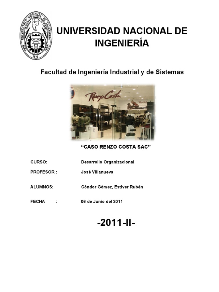 2.1.6. ANLISIS INTERNO La estrategia actual de la empresa es producir una cantidad fija de prendas de vestir a un precio competitivo y mejorar a un mas la satisfaccin del cliente y la rentabilidad de la empresa. Administracin: La empresa cuenta con una gestin estratgica, los trabajadores conocen las metas u objetivos (visin y misin) de esta. Existe una planificacin por parte de los jefes de cada rea. Existe un buen clima laboral donde los trabajadores se encuentran felices de pertenecer a esta empresa, se cuenta con puestos de trabajo claros, donde los operarios tienen una actividad definida. Marketing: En lo que se refiere a marketing, RENZO COSTA ha segmentado el mercado, teniendo como publico objetivo los sectores C y D. Segn informacin de los dueos, tienen competidores que venden el producto a precio ms bajo. Una de las ventajas que stos utilizan es comprar el cuero de otros proveedores, pero que no se comparan con la calidad de cuero que tiene RENZO COSTA. Sus canales de distribucin son sus propias tiendas (cuenta con 20 tiendas a nivel nacional), sin embargo gran parte de la produccin lo venden al extranjero. Realiza investigaciones de mercado, tratando de buscar nuevas oportunidades en el extranjero y poder expandirse mucho ms y lograr los objetivos planteados, sin embargo se preocupa en el mejoramiento continuo de calidad y ofrecer un producto a precios accesibles. Adems RENZO COSTA cuenta con promociones y publicidad ya sea fsicamente o utilizacin de redes sociales, adems de una pgina web actualizada y desfiles de moda en Lima de gran impacto. A nivel internacional aun falta trascender, lo que se busca es causar mayor golpe en su presentacin con una publicidad competitiva en un mercado muy difcil como el europeo.