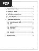 CAPITULO 1: ORGANIZACIN INTERNA 1.1 DATOS GENERALES DE LA EMPRESA 1.2 HISTORIA DELA EMPRESA 1.3 MISION Y VISION 1.4 ORGANIGRAMA DE LA EMPRESA 1.5 MAPEO DE PROCESOS DE LA EMPRESA 1.6 TIPO DE ORGANIZACIN 1.7 DESCRIPCION DE PUESTOS CAPITULO 2: PLANEAMIENTO ESTRETEGICO 2.1 MODELO DE PLANEAMIENTO ESTRATEGICO 2.1.1. CULTURA ORGANIZACIONAL Y VALORES. 2.1.2. VISION 2.1.3 OBJETIVOS ESTRATEGICOS 2.1.4. MISION 2.1.5. ANALISIS EXTERNO 2.1.6. ANALISIS INTERNO. 2.1.7. MATRIZ FODA 2.1.8. ESTRATEGIAS