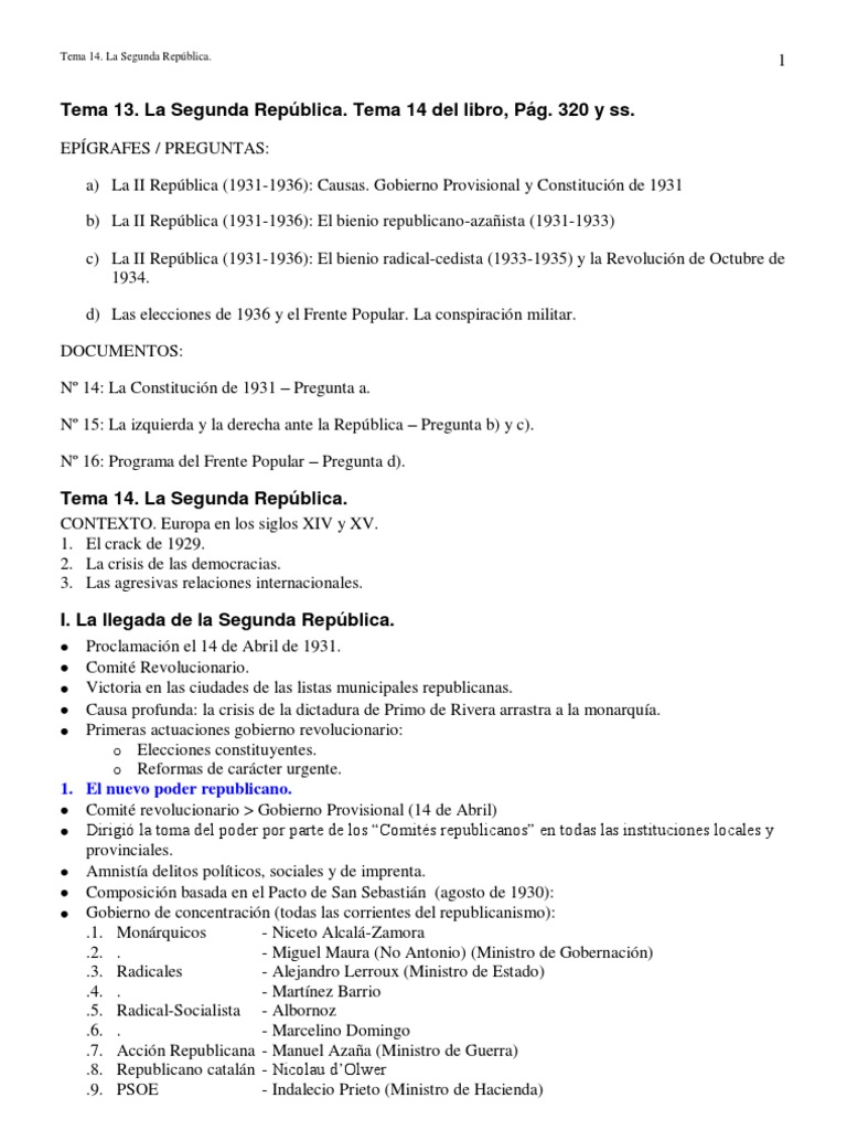 Tema 13. La Segunda República. Tema 14 del libro, Pág. 320 y ss.