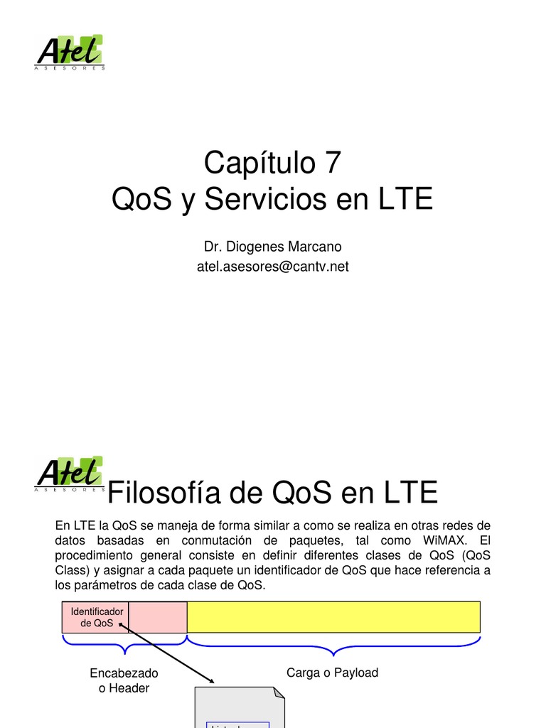 En LTE la QoS se maneja de forma similar a como se realiza en otras redes de datos basadas en conmutacin de paquetes, tal como WiMAX. El procedimiento general consiste en definir diferentes clases de QoS (QoS Class) y asignar a cada paquete un identificador de QoS que hace referencia a los parmetros de cada clase de QoS.