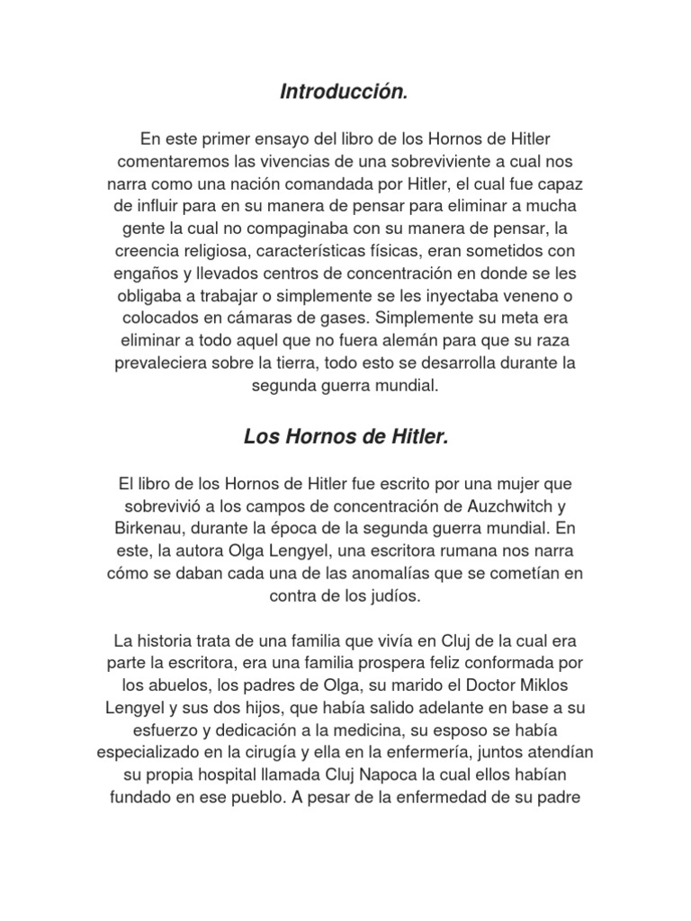En este primer ensayo del libro de los Hornos de Hitler comentaremos las vivencias de una sobreviviente a cual nos narra como una nacin comandada por Hitler, el cual fue capaz de influir para en su manera de pensar para eliminar a mucha gente la cual no compaginaba con su manera de pensar, la creencia religiosa, caractersticas fsicas, eran sometidos con engaos y llevados centros de concentracin en donde se les obligaba a trabajar o simplemente se les inyectaba veneno o colocados en cmaras de gases. Simplemente su meta era eliminar a todo aquel que no fuera alemn para que su raza prevaleciera sobre la tierra, todo esto se desarrolla durante la segunda guerra mundial.