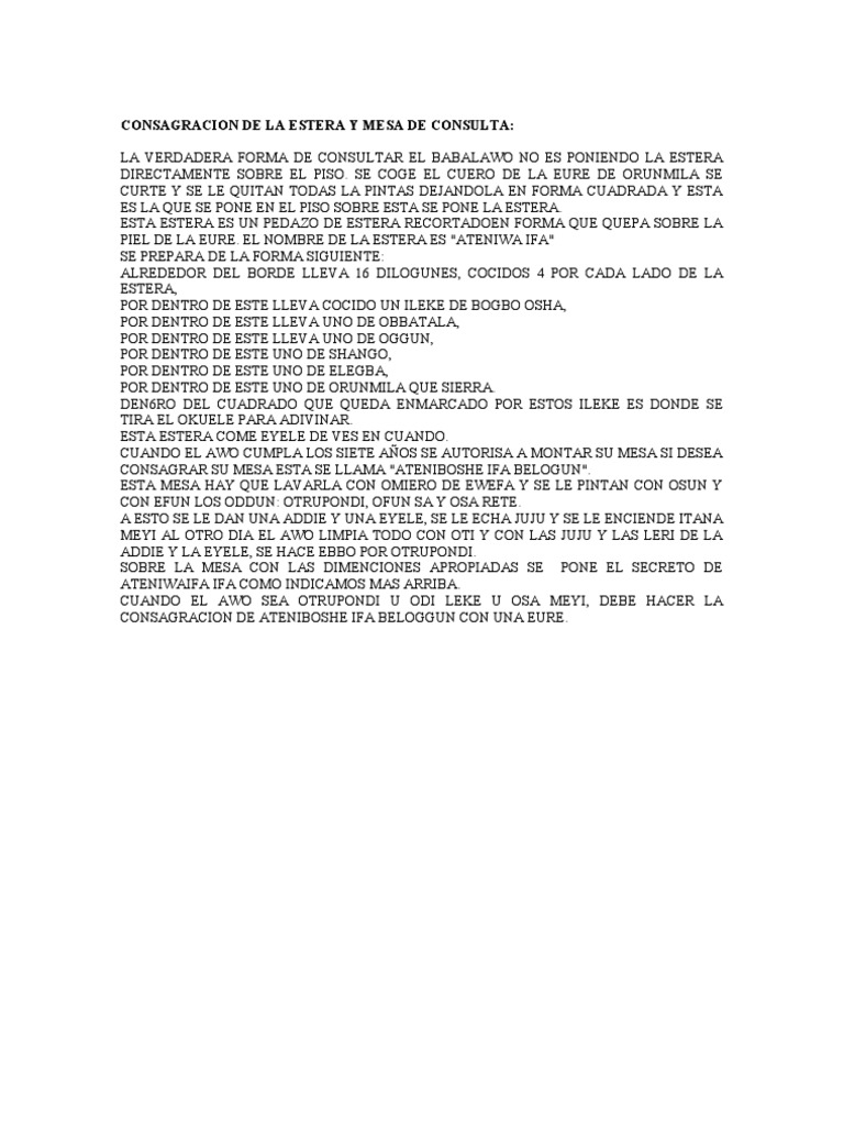 SE COGE EL CUERO DE LA EURE DE ORUNMILA SE CURTE Y SE LE QUITAN TODAS LA PINTAS DEJANDOLA EN FORMA CUADRADA Y ESTA ES LA QUE SE PONE EN EL PISO SOBRE ESTA SE PONE LA ESTERA. ESTA ESTERA ES UN PEDAZO DE ESTERA RECORTADOEN FORMA QUE QUEPA SOBRE LA PIEL DE LA EURE. EL NOMBRE DE LA ESTERA ES "ATENIWA IFA" SE PREPARA DE LA FORMA SIGUIENTE: ALREDEDOR DEL BORDE LLEVA 16 DILOGUNES, COCIDOS 4 POR CADA LADO DE LA ESTERA, POR DENTRO DE ESTE LLEVA COCIDO UN ILEKE DE BOGBO OSHA, POR DENTRO DE ESTE LLEVA UNO DE OBBATALA, POR DENTRO DE ESTE LLEVA UNO DE OGGUN, POR DENTRO DE ESTE UNO DE SHANGO, POR DENTRO DE ESTE UNO DE ELEGBA, POR DENTRO DE ESTE UNO DE ORUNMILA QUE SIERRA. DEN6RO DEL CUADRADO QUE QUEDA ENMARCADO POR ESTOS ILEKE ES DONDE SE TIRA EL OKUELE PARA ADIVINAR. ESTA ESTERA COME EYELE DE VES EN CUANDO. CUANDO EL AWO CUMPLA LOS SIETE AOS SE AUTORISA A MONTAR SU MESA SI DESEA CONSAGRAR SU MESA ESTA SE LLAMA "ATENIBOSHE IFA BELOGUN". ESTA MESA HAY QUE LAVARLA CON OMIERO DE EWEFA Y SE LE PINTAN CON OSUN Y CON EFUN LOS ODDUN: OTRUPONDI, OFUN SA Y OSA RETE. A ESTO SE LE DAN UNA ADDIE Y UNA EYELE, SE LE ECHA JUJU Y SE LE ENCIENDE ITANA MEYI AL OTRO DIA EL AWO LIMPIA TODO CON OTI Y CON LAS JUJU Y LAS LERI DE LA ADDIE Y LA EYELE, SE HACE EBBO POR OTRUPONDI. SOBRE LA MESA CON LAS DIMENCIONES APROPIADAS SE PONE EL SECRETO DE ATENIWAIFA IFA COMO INDICAMOS MAS ARRIBA. CUANDO EL AWO SEA OTRUPONDI U ODI LEKE U OSA MEYI, DEBE HACER LA CONSAGRACION DE ATENIBOSHE IFA BELOGGUN CON UNA EURE.