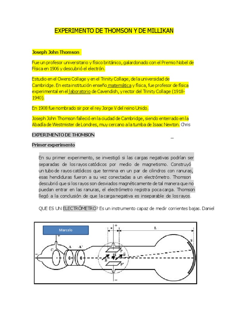 Joseph John Thomson Fue un profesor universitario y fsico britnico, galardonado con el Premio Nobel de Fsica en 1906 y descubri el electrn. Estudio en el Owens Collage y en el Trinity Collage, de la universidad de Cambridge. En esta institucin enseo matemtica y fsica, fue profesor de fsica experimental en el laboratorio de Cavendish, y rector del Trinity Collage (19181940). En 1908 fue nombrado sir por el rey Jorge V del reino Unido. Joseph John Thomson falleci en la ciudad de Cambridge, siendo enterrado en la Abada de Westmister de Londres, muy cercano a la tumba de Isaac Newton. Chris EXPERIMENTO DE THOMSON Primer experimento En su primer experimento, se investig si las cargas negativas podran ser separadas de los rayos catdicos por medio de magnetismo. Construy un tubo de rayos catdicos que termina en un par de cilindros con ranuras, esas hendiduras fueron a su vez conectadas a un electrmetro. Thomson descubri que si los rayos son desviados magnticamente de tal manera que no puedan entrar en las ranuras, el electrmetro registra poca carga. Thomson lleg a la conclusin de que la carga negativa es inseparable de los rayos. QUE ES UN ELECTRMETRO? Es un instrumento capaz de medir corrientes bajas. Daniel