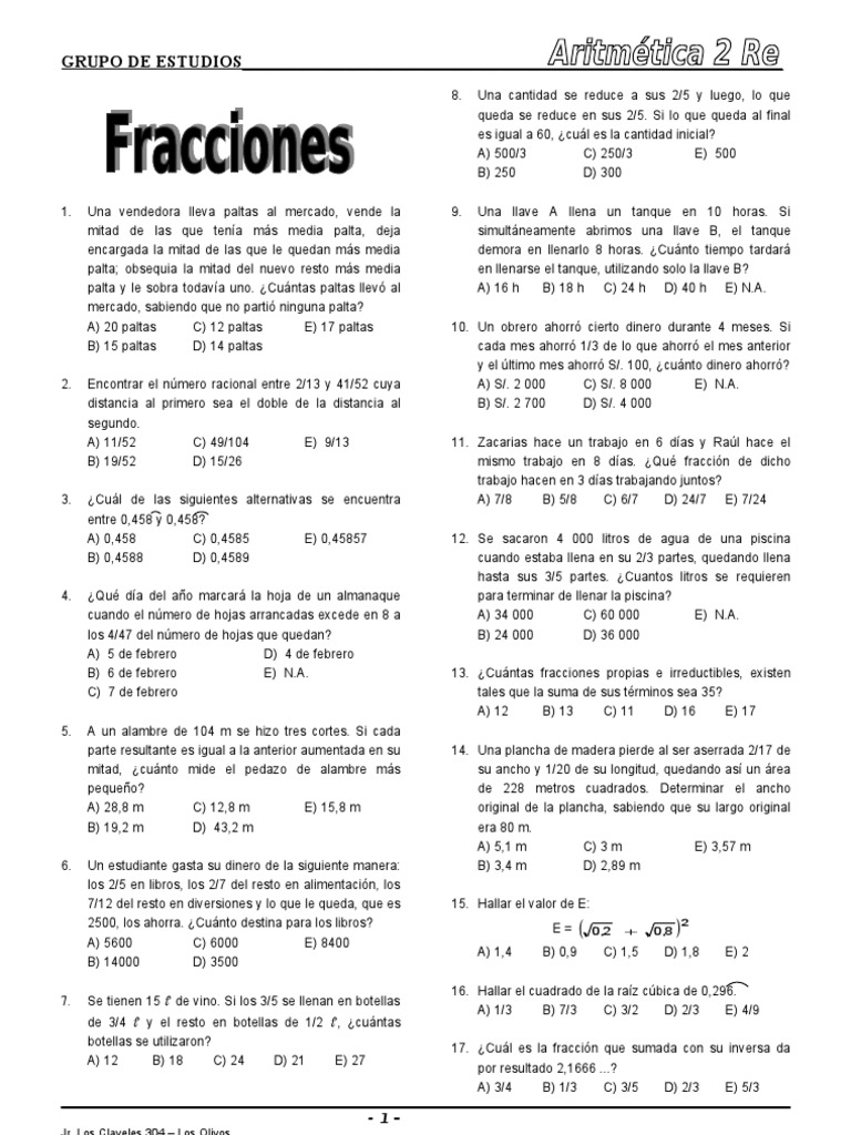 10. Un obrero ahorr cierto dinero durante 4 meses. Si cada mes ahorr 1/3 de lo que ahorr el mes anterior y el ltimo mes ahorr S/. 100, cunto dinero ahorr? A) S/. 2 000 C) S/. 8 000 E) N.A. B) S/. 2 700 D) S/. 4 000 11. Zacarias hace un trabajo en 6 das y Ral hace el mismo trabajo en 8 das. Qu fraccin de dicho trabajo hacen en 3 das trabajando juntos? A) 7/8 B) 5/8 C) 6/7 D) 24/7 E) 7/24 12. Se sacaron 4 000 litros de agua de una piscina cuando estaba llena en su 2/3 partes, quedando llena hasta sus 3/5 partes. Cuantos litros se requieren para terminar de llenar la piscina? A) 34 000 C) 60 000 E) N.A. B) 24 000 D) 36 000 13. Cuntas fracciones propias e irreductibles, existen tales que la suma de sus trminos sea 35? A) 12 B) 13 C) 11 D) 16 E) 17 14. Una plancha de madera pierde al ser aserrada 2/17 de su ancho y 1/20 de su longitud, quedando as un rea de 228 metros cuadrados. Determinar el ancho original de la plancha, sabiendo que su largo original era 80 m. A) 5,1 m C) 3 m E) 3,57 m B) 3,4 m D) 2,89 m 15. Hallar el valor de E: E= A) 1,4 B) 0,9