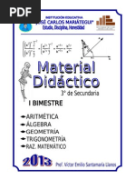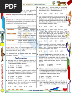10. Si 1/5 de lo que camin equivale a los 3/5 de los que me falta caminar, qu fraccin del camino total ya camin? A) 1/6 B) 1/3 C) 2/3 D) 3/4 E) N.A. 11. Una bola elstica cae al suelo y se eleva hasta los 2/3 de la altura anterior. Despus de haber rebotado tres veces, se ha elevado 2 m. De qu altura haba cado? A) 8 m C) 6,75 m E) 10,25 m B) 12 m D) 9,45 m 12. Un hombre hace una obra en dos das, otro hombre lo hace en seis das y un tercero lo hace en el promedio del tiempo de los otros dos. En cunto tiempo hacen la obra los tres juntos? A) 2 1 12 das C) 1 1 12 das E) N.A. B) 2 1/2 das D) 1 1 48 das