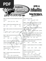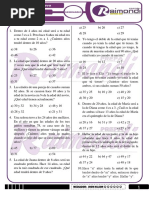 13. Dos caos pueden llenar un estanque de 24 litros en 5 y 6 horas, cada uno funcionando individualmente; mientras que un desage podra vaciarlo en 10 horas. Si se abren los tres y se cierran apenas se llena el estanque, calcular cuntos litros de agua se fueron por el desage. A) 7 B) 8 C) 9 D) 10 E) 12 14. Un padre reparte un terreno entre sus dos hijos. A uno le da los 9/24 y el valor de la fraccin que le toca al otro es 63 000. Hallar el valor del terreno. A) 112 000 C) 100 800 E) N.A. B) 121 000 D) 180 000 15. Efectuar: