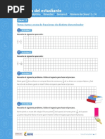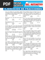 17. En los 3 ejercicios de una convocatoria quedan eliminados, respectivamente, el tercio, la cuarta y la tercera parte de los aspirantes que se pueden presentar en cada ejercicio. Si son 226 las plazas que se han cubierto, cuntos aspirantes se presentaron? A) F.D. B) 600 C) 540 D) 678 E) 548 18. Los 4/5 de las aves de una granja son palomas, los del resto son gallinas y las 4 aves restantes gallos. Cuntas aves hay en la granja? A) 76 B) 82 C) 80 D) 72 E) 81 19. Cunto le falta a 3/7 para ser igual al cociente de dividir 8/7 entre 7/6? A) 27/49 C) 3/7 E) 12/7 B) 25/49 D) 9/7 20. Al mirar un reloj se observa que los 3/5 de lo que queda del da es igual al tiempo transcurrido. Qu hora es? A) 9 a.m. C) 11 a.m. E) 6 p.m. B) 3 a.m. D) 3 p.m. 21. Cul es el producto de los nmeros decimales peridicos 0,111 1 ... y 0,818 181 ...? A) 1/9 B) 1/11 C) 9/11 D) 1/99 E) 3/11 22. Una fraccin irreductible se multiplica por 5 y la misma fraccin se divide entre 7. Si el producto de ambos resultados es 3,8, halla la suma del numerador y denominador de la fraccin original. A) 9 B) 8 C) 10 D) 11 E) 7 23. Tres choferes se reparten S/. 205 de tal manera que el primero recibe los 2/5 del segundo y este los 3/4 del tercero. Cunto le toc al chofer que recibi menos? A) S/. 100 C) S/. 50 E) S/. 25 B) S/. 75 D) S/. 30 24. Un excursionista parte en su auto a las 8 a.m. hacia un lugar distante 504 km. Tres horas despus se obtiene y se percata que la fraccin transcurrida del da es idntica a la fraccin de camino que le queda. Qu velocidad tiene en km/h? A) 82 B) 83 C) 91 D) 92 E) 80 25. Hallar el resultado de la siguiente suma: E= A) 1/3 26. Qu parte de los 3/4 de 6, es lo que le falta a 1/5 de 3/4 para ser igual a 7/3 de los 4/5 del cuadrado del inverso de 2? A) 57/200 C) 19/90 E) 20/240 B) 19/270 D) 21/245 27. Un recipiente est lleno hasta los 7/9 de su capacidad, Si extrae una cantidad de agua que es igual a los 3/4 de lo que queda. La cantidad de agua que se ha extrado, qu fraccin de la capacidad del recipiente representa?. A) 3/25 B) 3/4 C) 1/4 D) 7/12 E) 1/3 28. Hallar el decimal equivalente a: