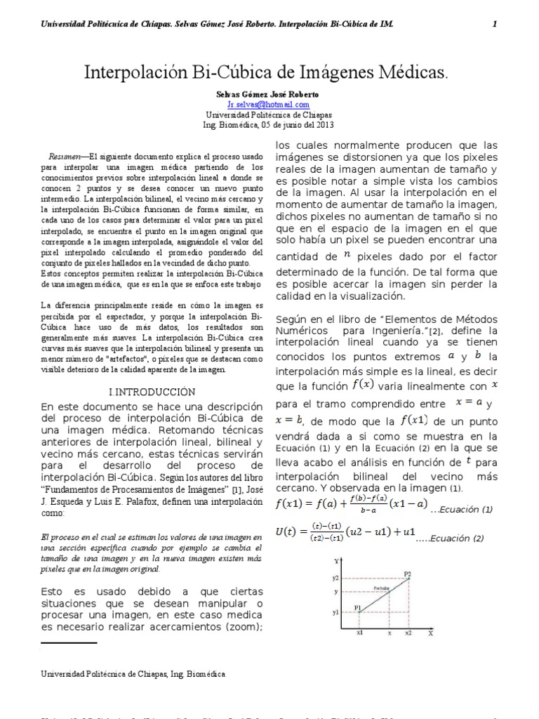 Selvas Gmez Jos Roberto Jr.selvas@hotmail.com Universidad Politcnica de Chiapas Ing. Biomdica, 05 de junio del 2013 ResumenEl siguiente documento explica el proceso usado para interpolar una imagen mdica partiendo de los conocimientos previos sobre interpolacin lineal a donde se conocen 2 puntos y se desea conocer un nuevo punto intermedio. La interpolacin bilineal, el vecino ms cercano y la interpolacin Bi-Cbica funcionan de forma similar, en cada uno de los casos para determinar el valor para un pixel interpolado, se encuentra el punto en la imagen original que corresponde a la imagen interpolada, asignndole el valor del pixel interpolado calculando el promedio ponderado del conjunto de pixeles hallados en la vecindad de dicho punto. Estos conceptos permiten realizar la interpolacin Bi-Cbica de una imagen mdica, que es en la que se enfoca este trabajo La diferencia principalmente reside en cmo la imagen es percibida por el espectador, y porque la interpolacin BiCbica hace uso de ms datos, los resultados son generalmente ms suaves. La interpolacin Bi-Cbica crea curvas ms suaves que la interpolacin bilineal y presenta un menor nmero de "artefactos", o pxeles que se destacan como visible deterioro de la calidad aparente de la imagen.