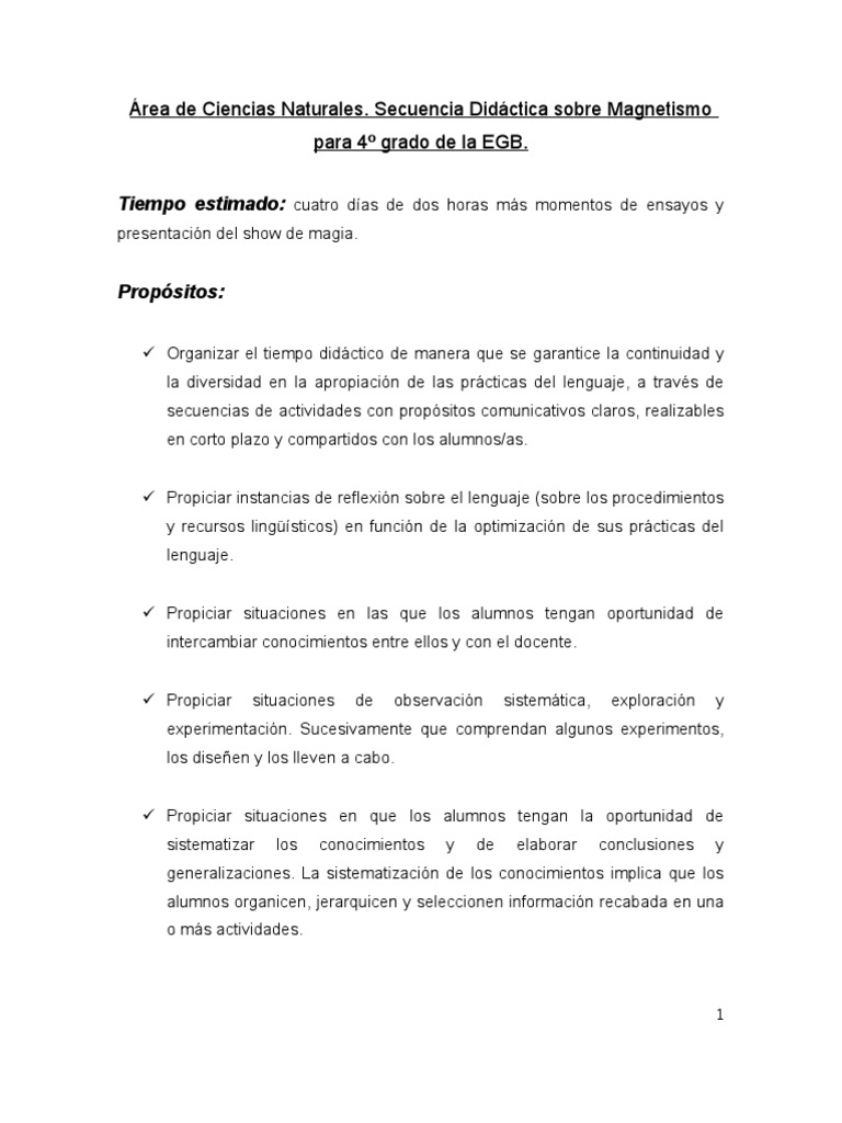 La secuencia de Magnetismo ser desarrollada para intentar acercar e introducir a los alumnos de cuarto grado en la formacin cientfica, entendiendo ese proceso como el resultado de las actividades en las que los nios directamente descubren, conocen y se acercan a aspectos cientficos que conforman su realidad. Las distintas preguntas que les plantearemos apuntan a que incorporen aspectos claves de la cultura cientfica como un espritu de curiosidad constante, la exploracin sistemtica de los fenmenos naturales, la discusin de ideas en base a evidencias y la construccin colectiva del conocimiento. Nos pareci que el magnetismo adems de ser un contenido curricular correspondiente al ao, es un tpico al que pueden aproximarse basndose fundamentalmente en la observacin, manipulacin y experimentacin. Sumado a esto, los materiales y recursos necesarios, en general, se pueden encontrar sin dificultad y no representan ningn peligro para ser manipulados. El trabajo con materiales concretos es una buena oportunidad para desarrollar actividades de indagacin, para ensearles tanto los conceptos pertinentes como las competencias cientficas a las que acudimos. A su vez, permite discutir con los alumnos aspectos fundamentales del diseo experimental y nos da la oportunidad de que ellos puedan confrontar sus ideas con sus propios resultados y con los de sus pares, imaginando posibles maneras de dar cuenta de las diferencias encontradas.