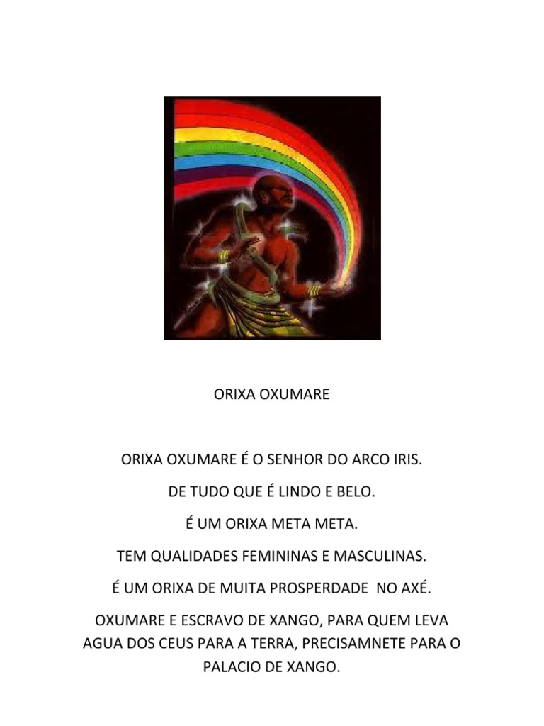 ORIXA OXUMARE O SENHOR DO ARCO IRIS. DE TUDO QUE LINDO E BELO. UM ORIXA META META. TEM QUALIDADES FEMININAS E MASCULINAS. UM ORIXA DE MUITA PROSPERDADE NO AX. OXUMARE E ESCRAVO DE XANGO, PARA QUEM LEVA AGUA DOS CEUS PARA A TERRA, PRECISAMNETE PARA O PALACIO DE XANGO.